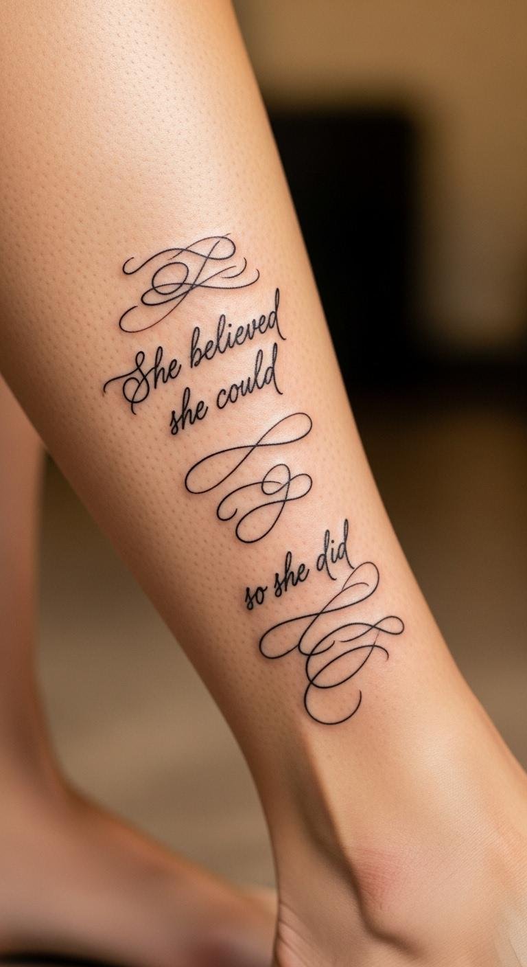 Script tattoos put meaningful words on your leg. Phrases like dreams or strength stand out. Place on the shin for easy view. Write quotes on paper to test flow. Use notebooks you already have. Look for tattoo deals online under $70. Select simple fonts for savings. These add motivation to your day. Pair with symbols for extra meaning. Wear them proudly in daily life.