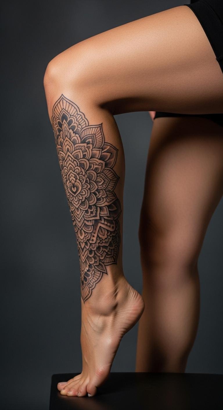 Mandala tattoos offer symmetry on your leg. Circles with patterns create balance. Try the ankle for a discreet look. Trace mandalas on skin with a pen first. Download free patterns online. Artists might charge $60 for simple ones. Go for black and gray to keep it cheap. These tattoos suit yoga outfits. Add personal twists like dots. It’s a calming choice that builds assurance.
