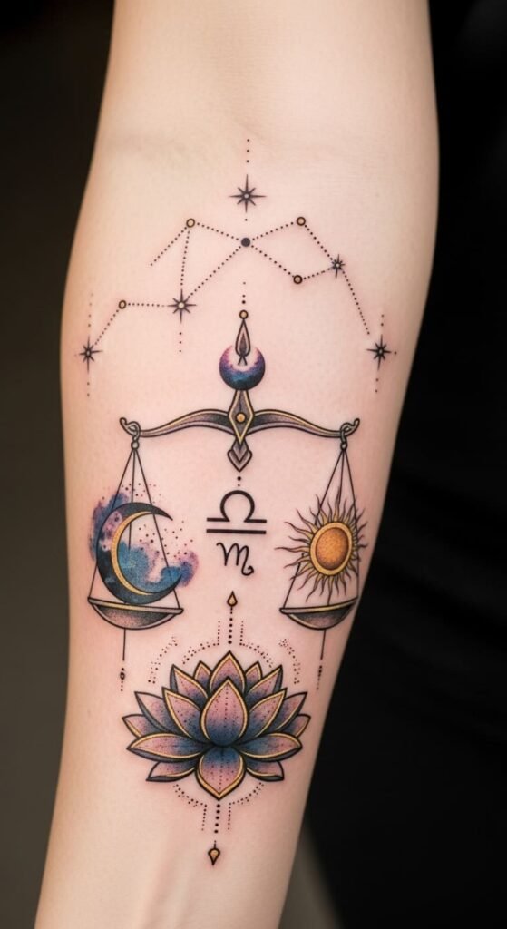Geometric designs add a modern edge to Libra symbols. Combine stars with sharp-edged scales for a bold pattern. Place it on your forearm for visibility. Use free online tools to draw your own version before committing. Opt for affordable ink sessions at community studios. Add colors like blue for the stars if you want pop, but stick to basics to save money. Experiment with stencils at home using household items. This style highlights harmony through shapes. Keep it small to reduce pain and cost. You’ll find it easy to show off or cover up. Make it unique by adding a small dot pattern.