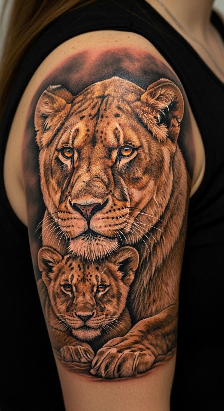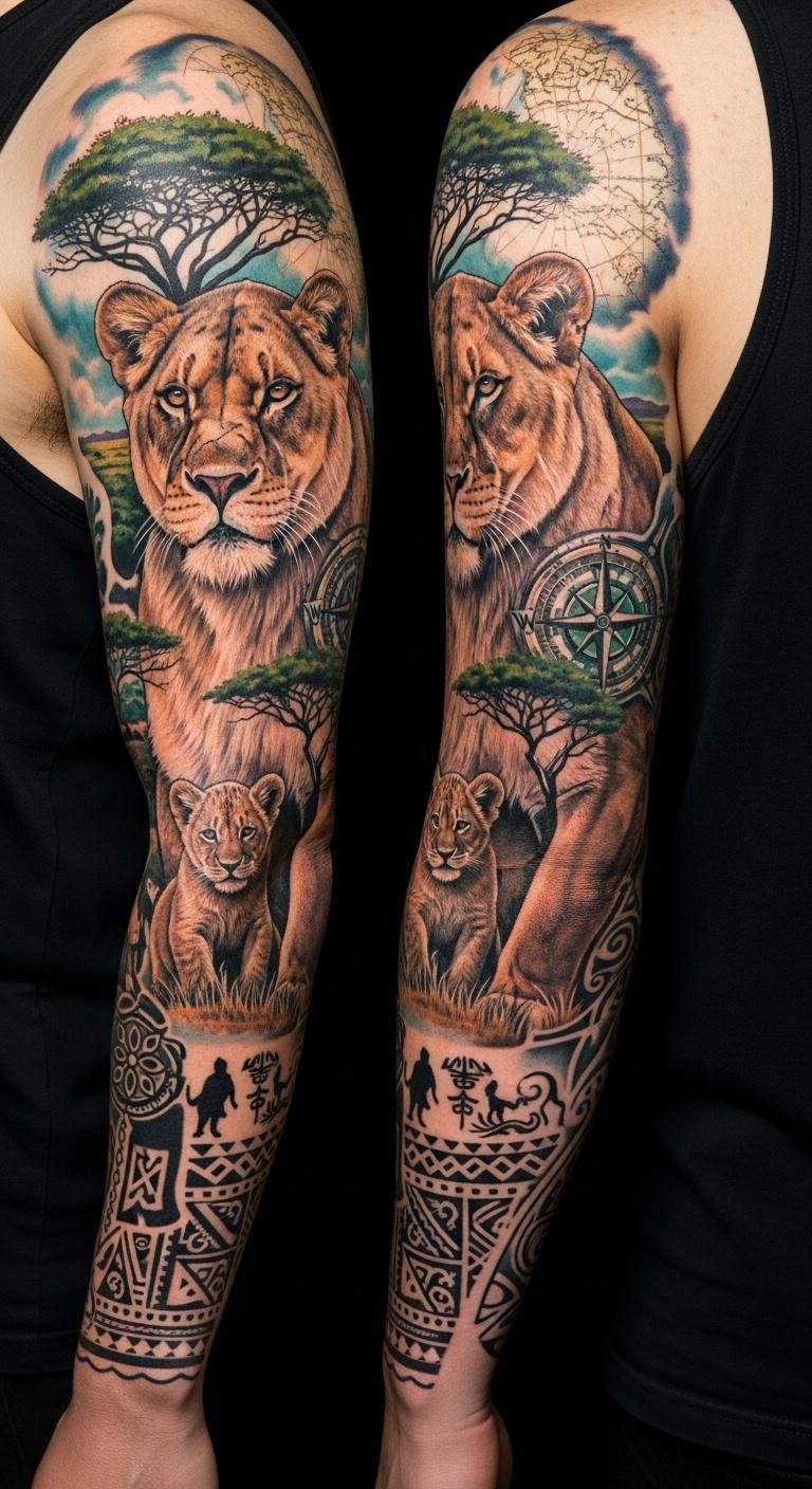 Full sleeve lioness story unfolds. Build over time. Bold the key: story design. Plan sessions. Spread payments.