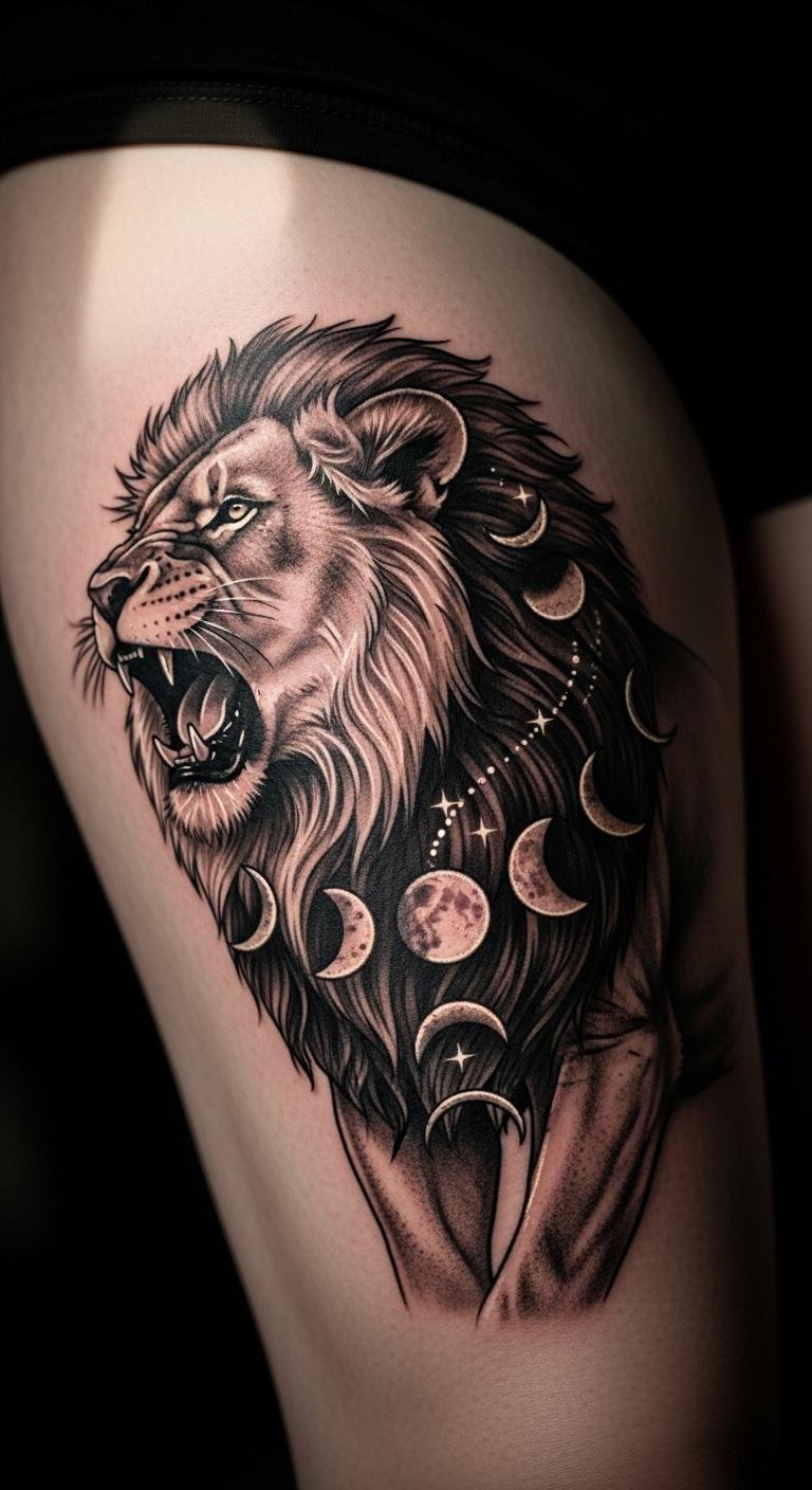 Lioness with moon phases adds cosmic vibes. Put it on your thigh for flow. Draw phases with circles. Bold the key: moon design. Save by grouping with friends. Use moon charts for inspiration.