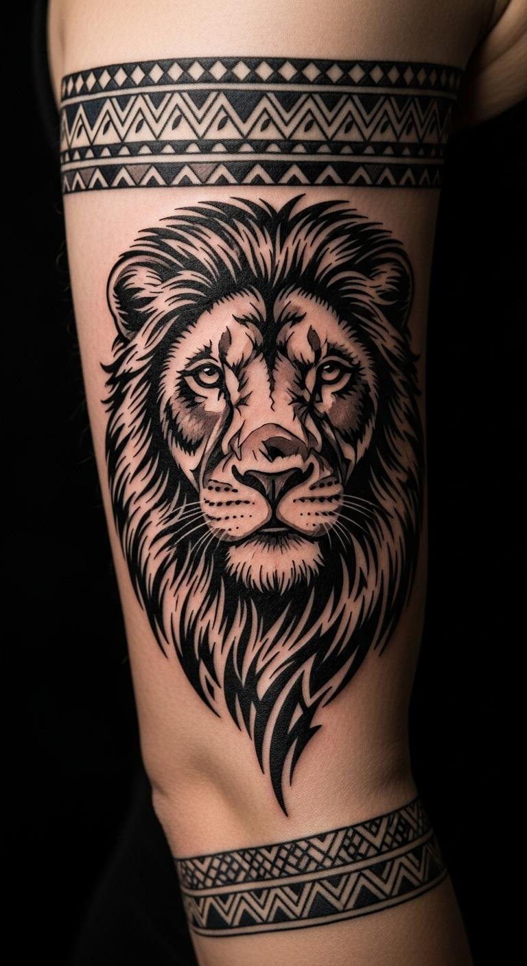 Tribal lioness edges add culture. On your arm it stands out. Bold the key: edges design. Trace patterns. Budget wisely.