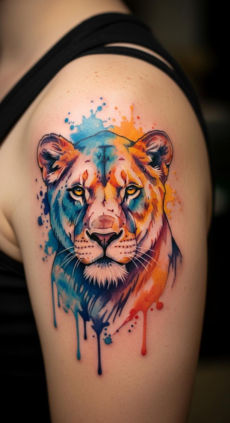 Watercolor lioness blend is artistic. Shoulder placement works well. Bold the key: blend design. Practice with watercolors. Keep costs low.