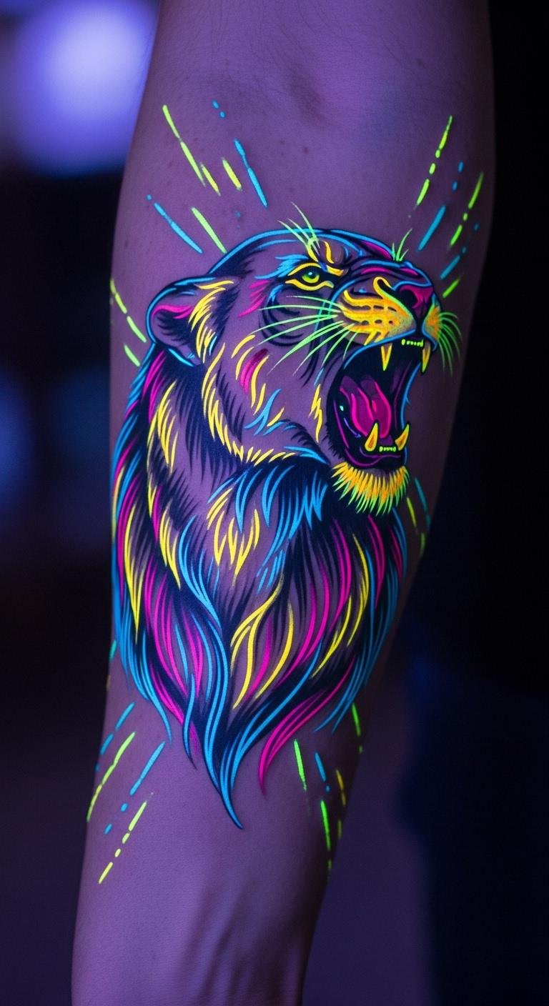 Neon lioness glow stands out. Arm for visibility. Bold the key: glow design. Test with glow sticks. Glow in the dark.