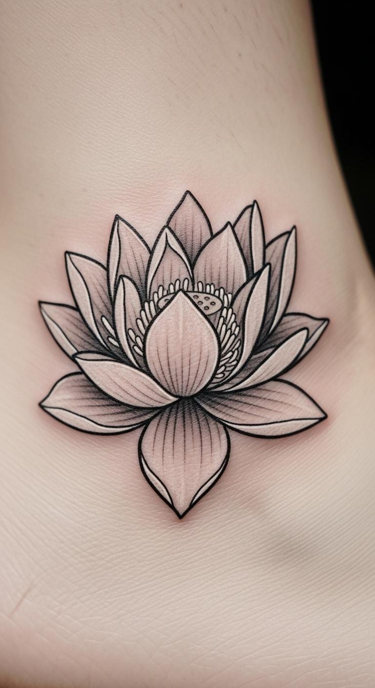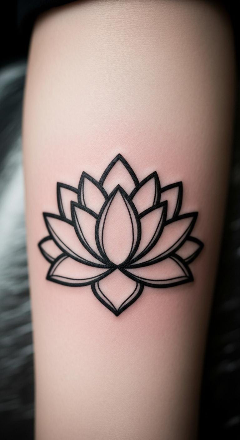 A black ink lotus keeps things straightforward and elegant. Think of it as your go-to for a no-fuss design. This style highlights the flower’s shape without extra colors. You get a symbol of rebirth that lasts. Start by sketching a basic lotus on paper to see how it fits. Pick a spot like your wrist for easy viewing. For budget options, use free online templates to plan. Add a small twist, like varying petal sizes, to make it yours. Keep sessions short with a local artist to save money. Bold the key: inner peace comes from simple choices. Try drawing with a pen first to test ideas. This approach helps you feel connected before ink hits skin.