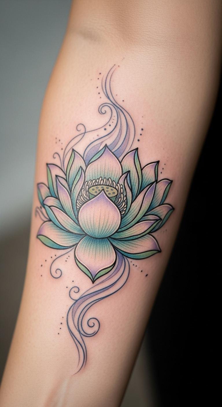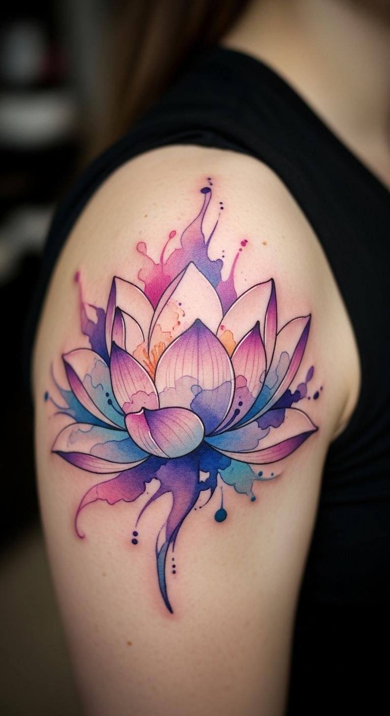 Watercolor lotus tattoos bring a splash of color and softness. They mimic real flowers with gentle blends. This design feels artistic and light. Choose hues that match your vibe, like soft pinks for calm. Draw inspiration from nature photos you snap on your phone. For less cost, practice blending colors on paper with markers. Place it on your ankle for a subtle touch. Go for smaller sizes to cut expenses. Bold this phrase: spiritual growth shines through the fades. Mix in personal elements, like a favorite flower, during your sketch phase. This makes the tattoo uniquely yours and affordable to create.