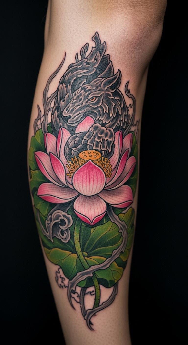 Animal hybrid lotus tattoos mix creatures and flowers. They tell unique stories. Start by combining sketches. Place it on your leg for story. Add simple animals to save. Bold the mix: struggle and triumph creatively. Practice drawing hybrids. This option innovates affordably.