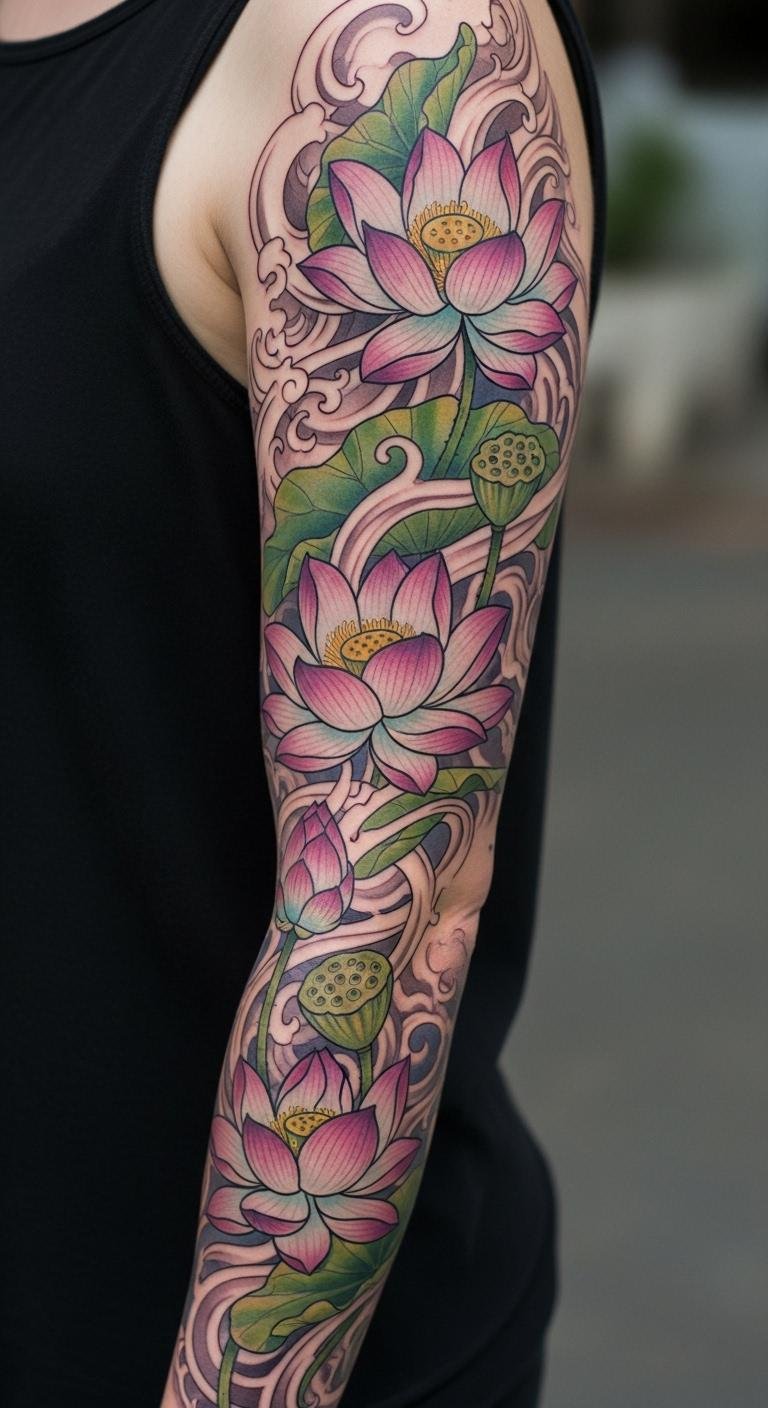 Arm lotus sleeves cover with meaning. They flow from wrist up. Plan with paper wraps. Build gradually for cost. Bold the flow: personal transformation layered. Start small. This sleeve inspires over time.