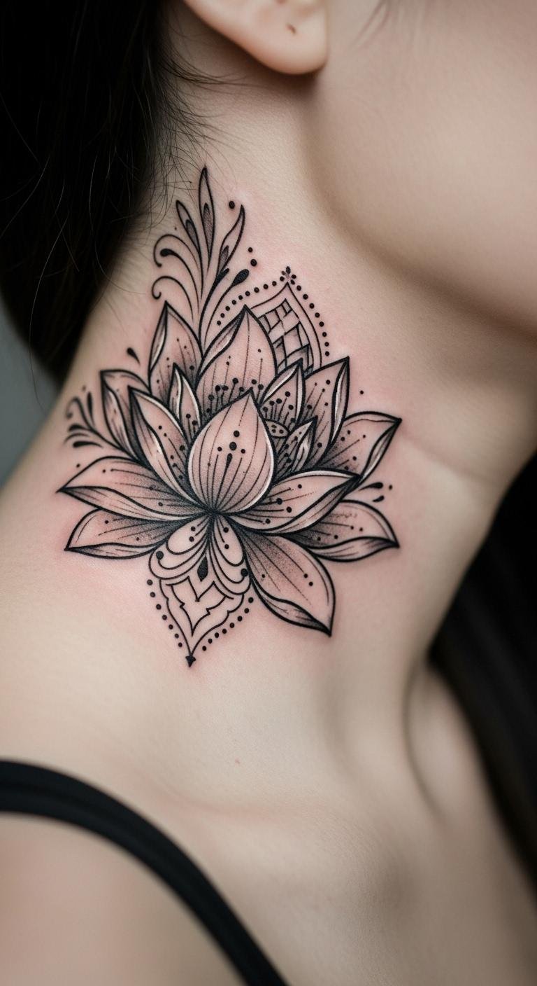 Neck lotus tattoos keep you aware. They sit high and visible. Sketch lightly first. Opt for small sizes. Bold the awareness: spiritual awakening near. Save with basics. This spot alerts daily.