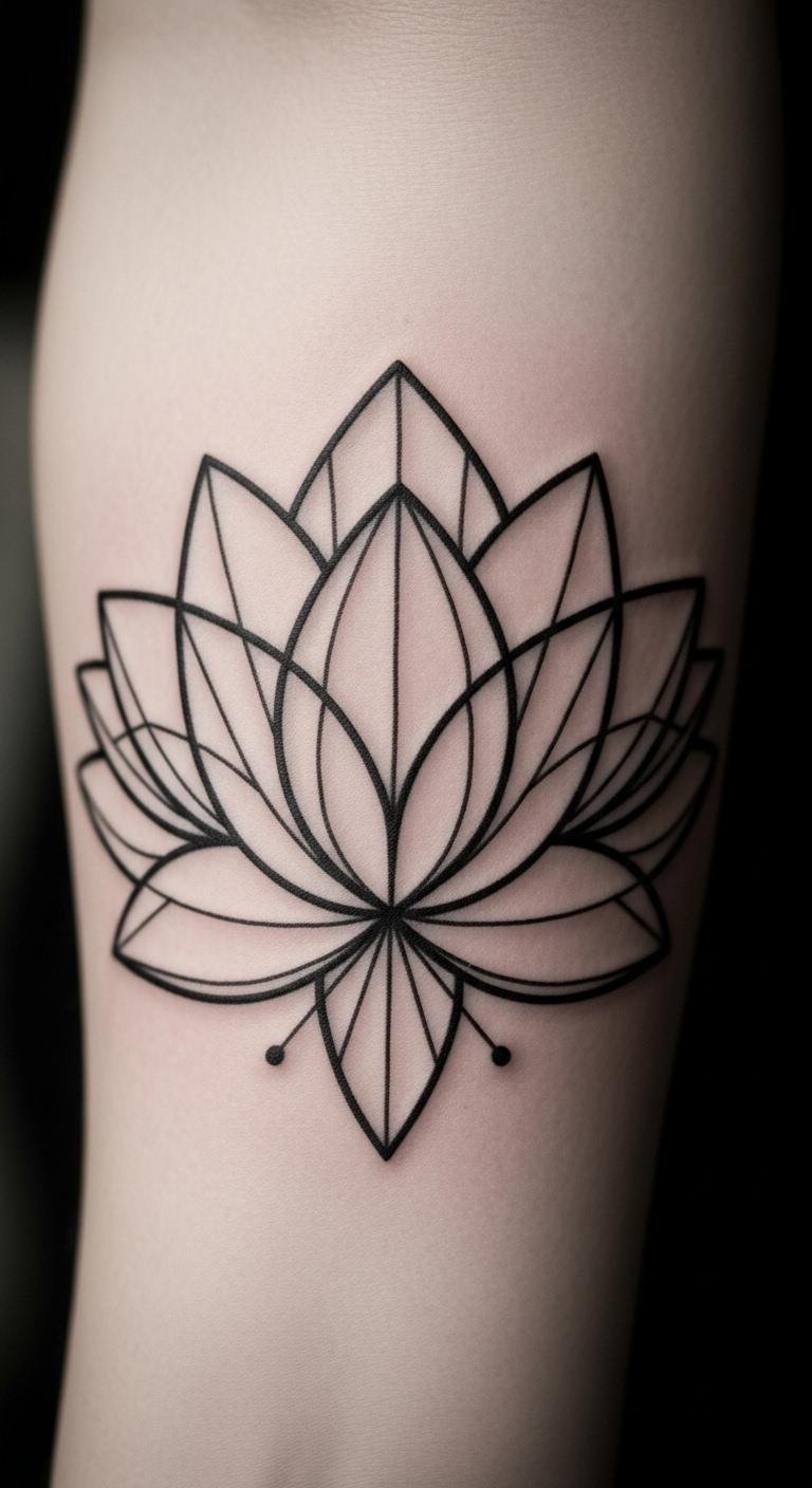 Geometric lotus tattoos mix shapes and symmetry for a modern look. They turn the flower into cool patterns. This style appeals if you like clean edges. Start by tracing simple shapes on paper to build your design. Opt for black lines to keep costs down. Put it on your back for a bold statement. Use free apps to experiment with patterns before deciding. Bold the idea: personal transformation through simple forms. Add triangles or circles for extra flair without extra fees. This method lets you customize affordably and easily.