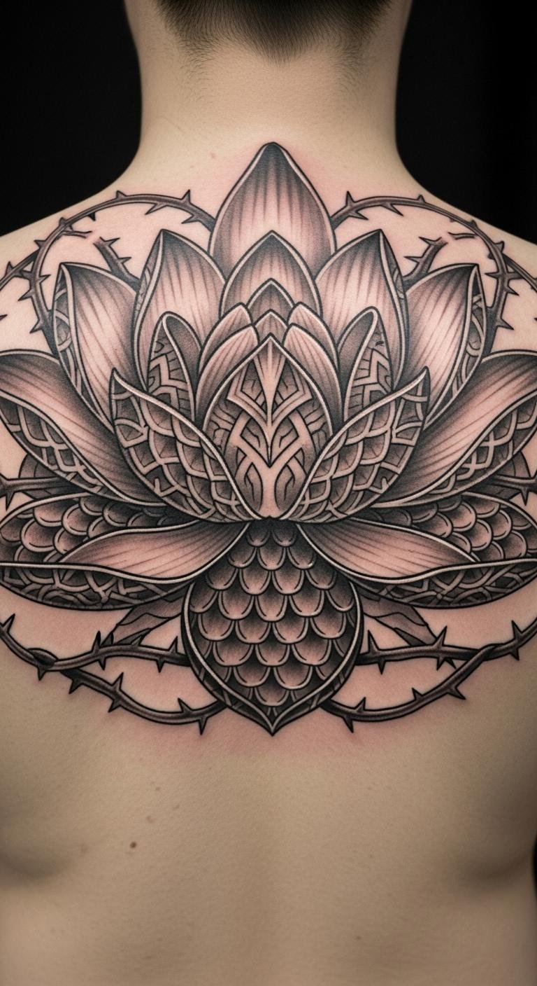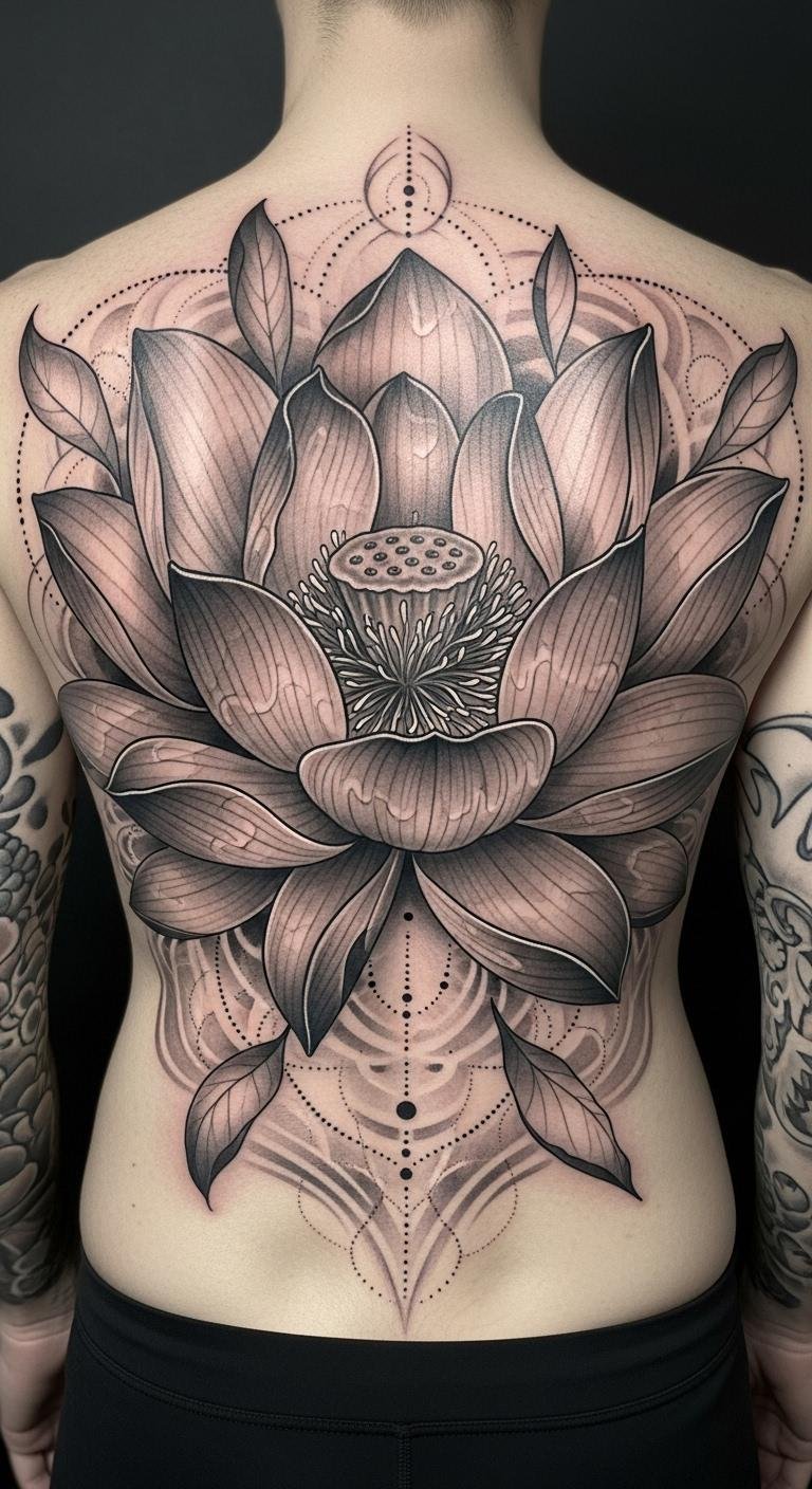 Full back lotus tattoos create a canvas of calm. They span wide. Plan with body outlines. Phase it for budget. Bold the canvas: hidden strength wide. Start sections. This design envelops affordably.