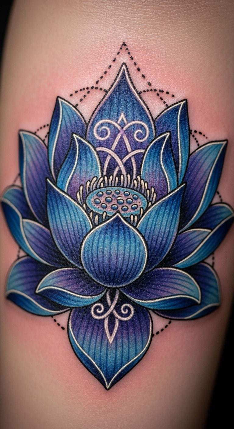 Blue lotus tattoos evoke wisdom and depth. The color adds a thoughtful layer. Sketch blue petals on paper to test. Put it on your arm for easy sight. Use affordable blue pens for practice. Bold the wisdom: personal growth through shades. Keep it simple to save money. This choice makes wisdom accessible.
