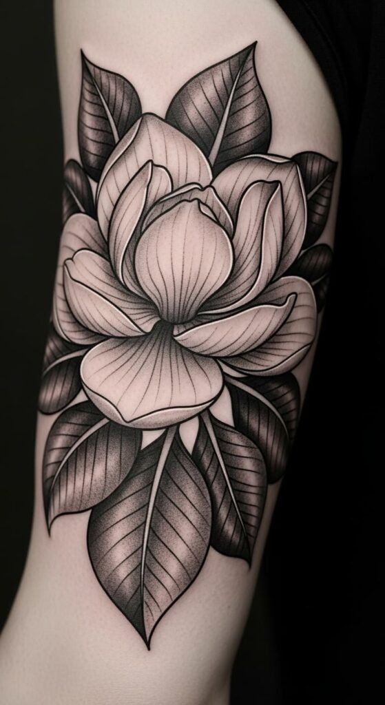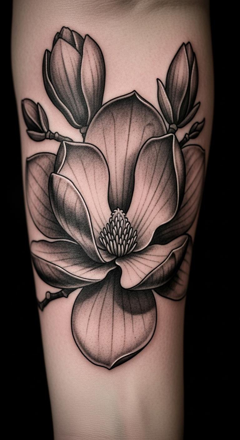 Black and grey magnolias look lifelike. Imagine detailed shading on your arm. This style adds realism. Draw grey scales at home. Use free shading tutorials. Choose artists for $110. Stick to monochrome for affordability. Include petal textures. This design ages well. Place it visibly. Experiment with pencils first. It brings depth easily. Focus on light areas. You’ll value the classic vibe.