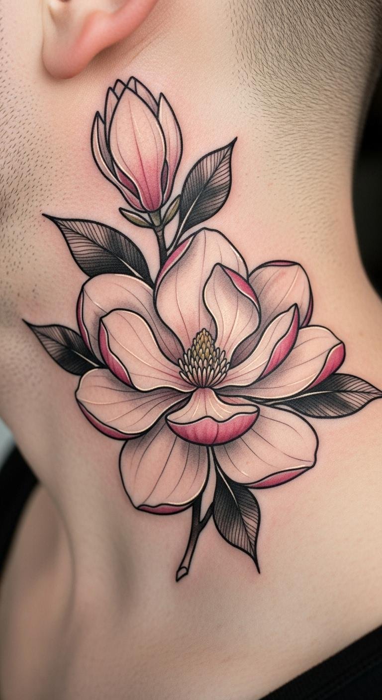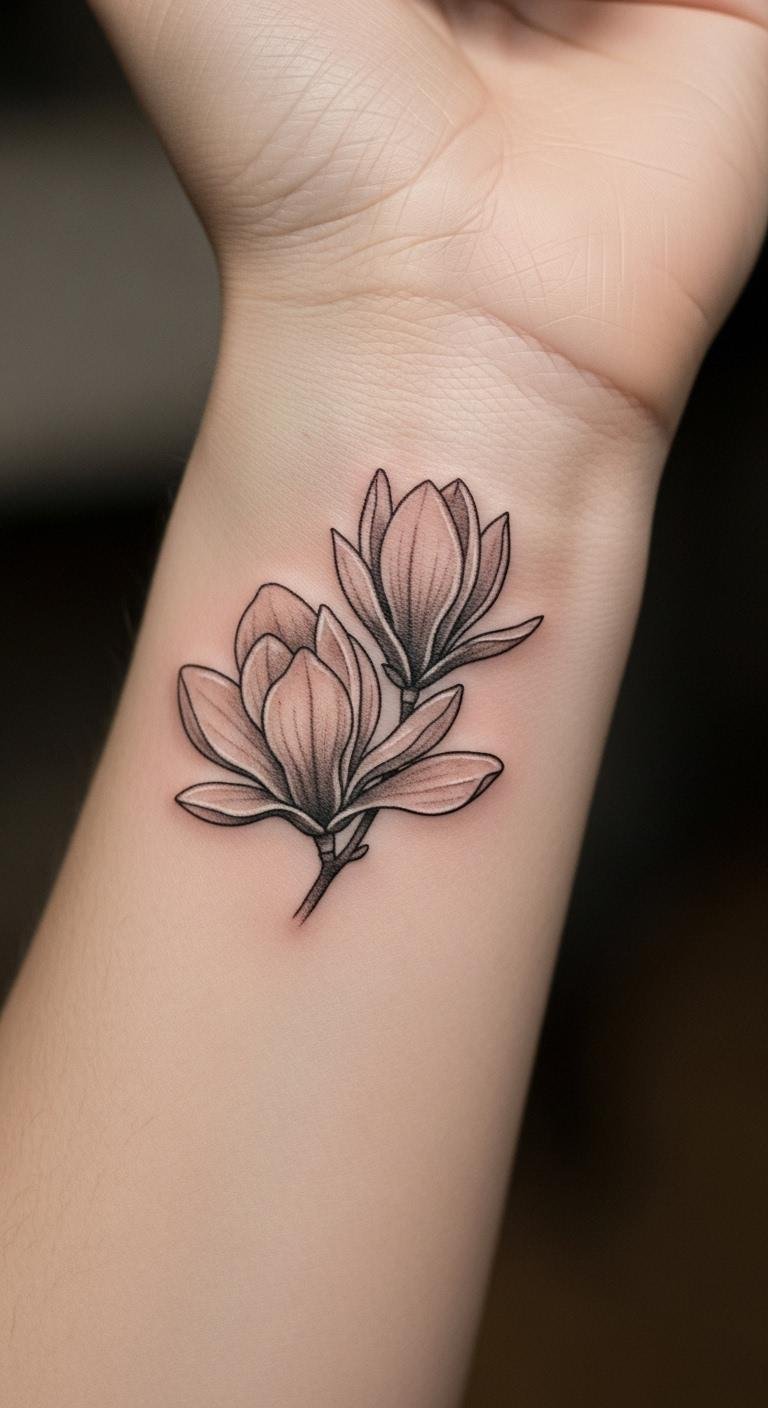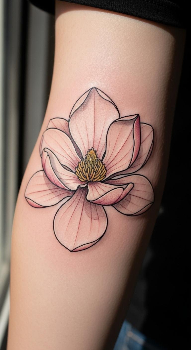 A single magnolia bloom keeps things simple yet striking. Picture a clean outline of the flower on your forearm. This design highlights the flower’s natural shape. Start by sketching it at home with basic pencils and paper. Use online templates for free ideas. Choose a local artist for under $100 if you’re on a budget. Keep the size small to cut costs. Add personal touches like a slight curve to the petals. This tattoo works for first-timers. It shows endurance without overwhelming detail. Think about your daily routine before picking a spot. Pair it with everyday clothes for easy show-off. Get friends’ opinions on simple drawings. This approach saves money and sparks creativity. Focus on what draws you to magnolias. You’ll have a timeless piece that fits your life.