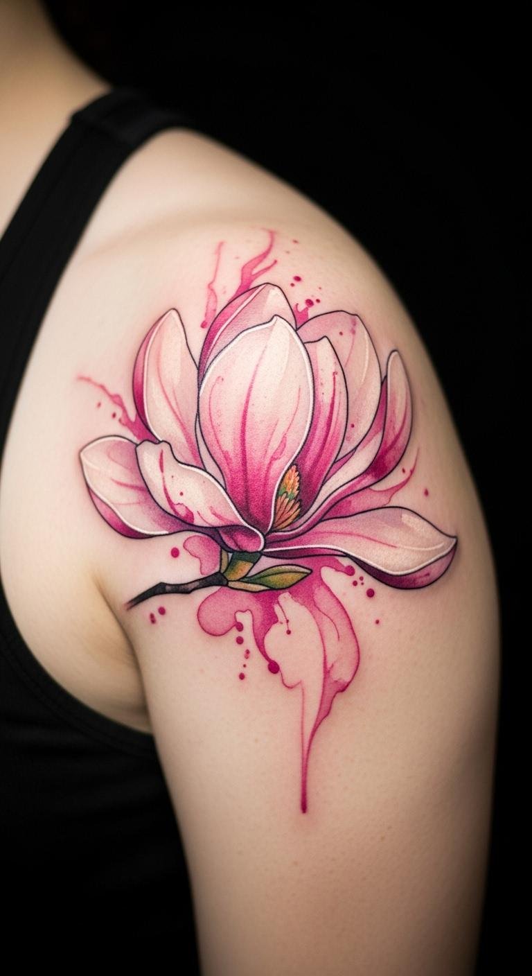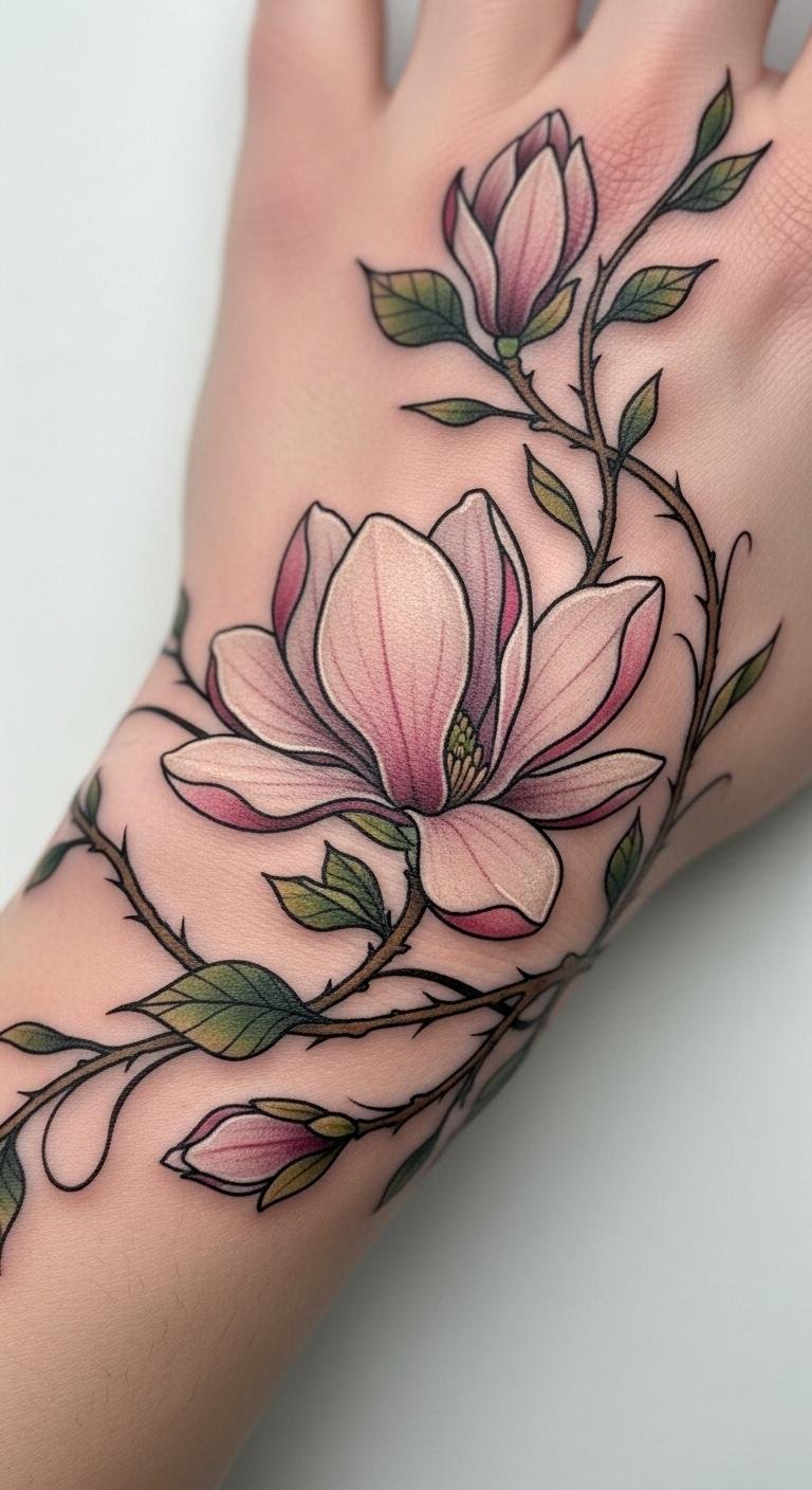 Watercolor magnolias bring a painted feel to your skin. Imagine soft blends of pink and white on your wrist. This style mimics brush strokes for an artistic look. Draw inspiration from free apps on your phone. Experiment with watercolors on paper first. Find an affordable artist through local listings. Aim for sessions under $150. Keep colors minimal to lower ink costs. Add leaves for extra flair without complexity. This design suits creative types. Place it where you can see it daily. Try quick sketches during breaks. It adds a dreamy touch to your routine. Focus on blending techniques with household supplies. You’ll create a piece that feels personal and light.