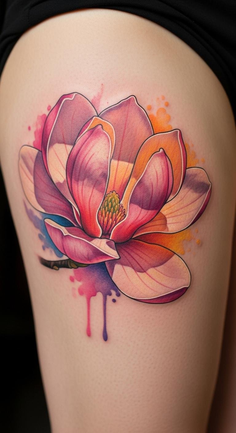Gradient magnolias pop with color shifts. Think of fading hues on your leg. This method creates vibrancy. Blend colors on paper first. Find free gradient guides. Book for around $130. Use two shades to save. Add gradual fades. This design brightens skin. Test with markers. It adds energy. Focus on smooth blends. You’ll find it eye-catching.