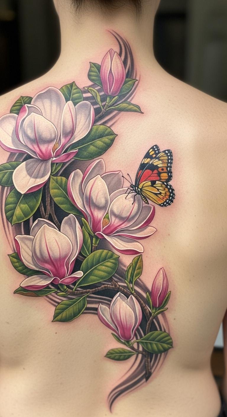 Magnolias with butterflies add whimsy. Envision a butterfly near the flower on your back. This combo sparks joy. Draw both on paper quickly. Search free combo ideas. Get it for $140. Keep elements simple. Include wing details. This design feels alive. Place it centrally. Try stickers first. It tells a fun story. Focus on balance. You’ll smile at the result.