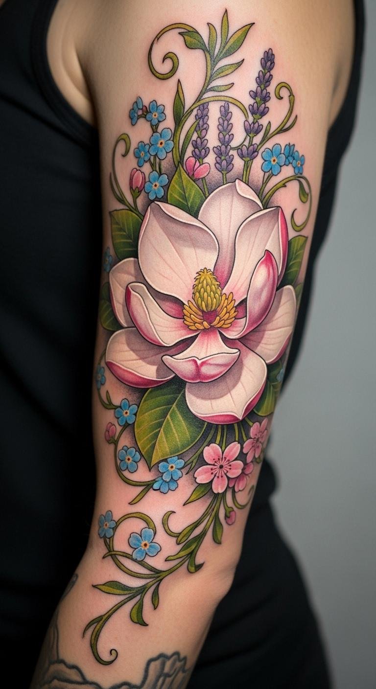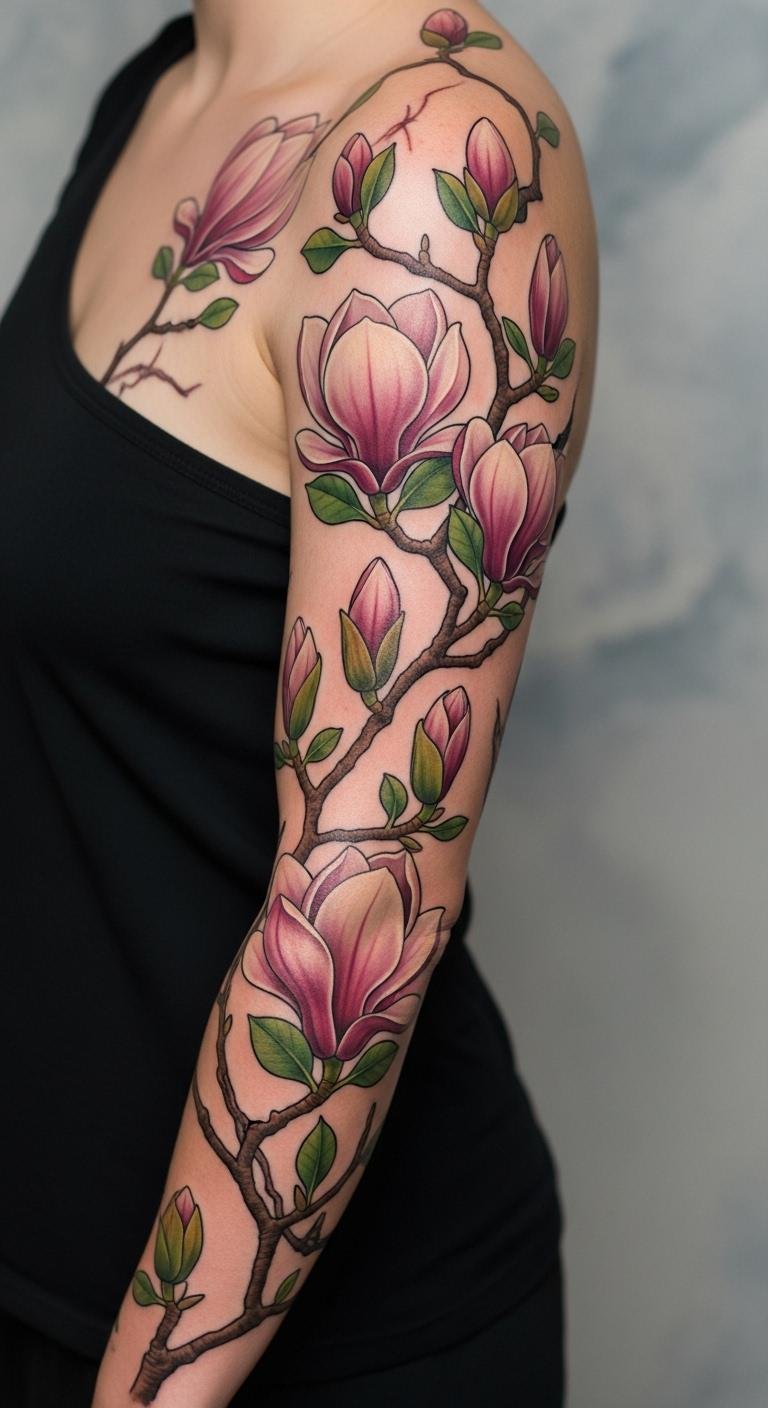 Full sleeve magnolias create a symphony. Think of flowers covering your arm. This design fills space. Plan layouts on paper. Use free sleeve guides. Book multiple sessions for $300. Start with key elements. Add layers over time. This spot tells epics. Practice arm sketches. It builds a masterpiece. Focus on flow. You’ll admire the completeness.