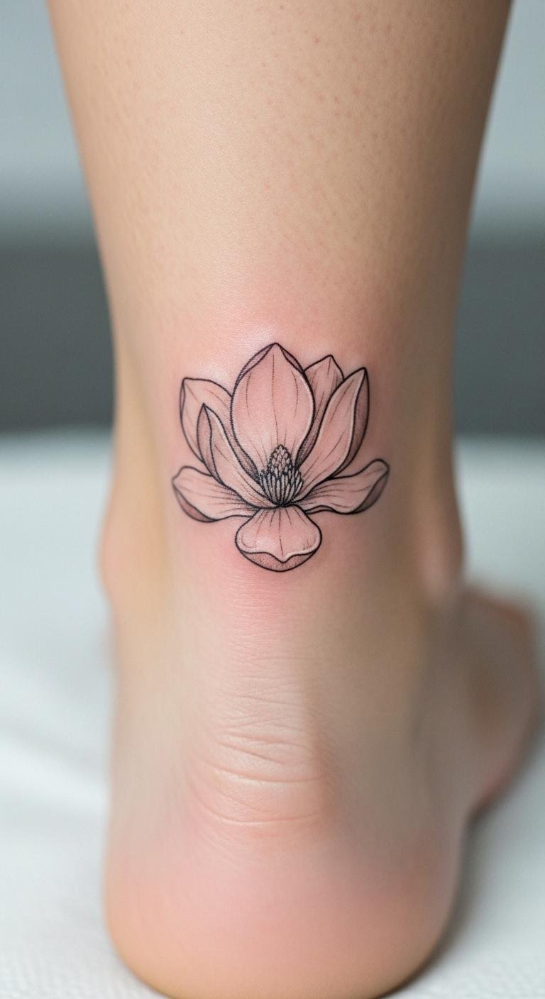 Small ankle magnolias stay subtle. Imagine a tiny design on your ankle. This spot keeps it hidden. Sketch small versions. Use free tiny templates. Get it for $70. Opt for basic ink. Add a petal accent. This design fits shoes. Try temporary ones. It adds a secret. Focus on size. You’ll find it convenient.