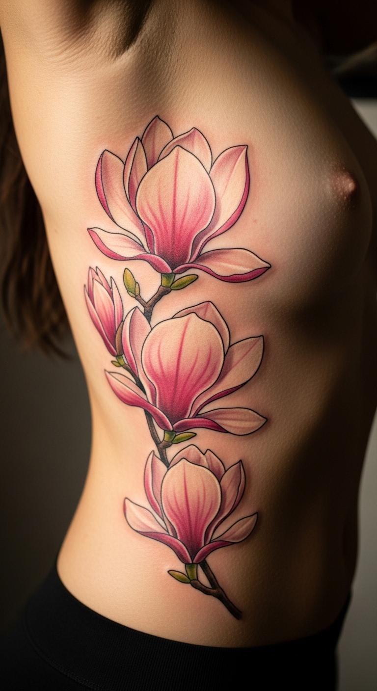 Ribcage magnolias offer privacy. Envision the flower curving on your ribs. This design feels personal. Draw on your side first. Find free rib templates. Plan for $130. Keep it simple. Add flow to lines. This area suits secrets. Use body paint tests. It adds meaning. Focus on curves. You’ll cherish the spot.