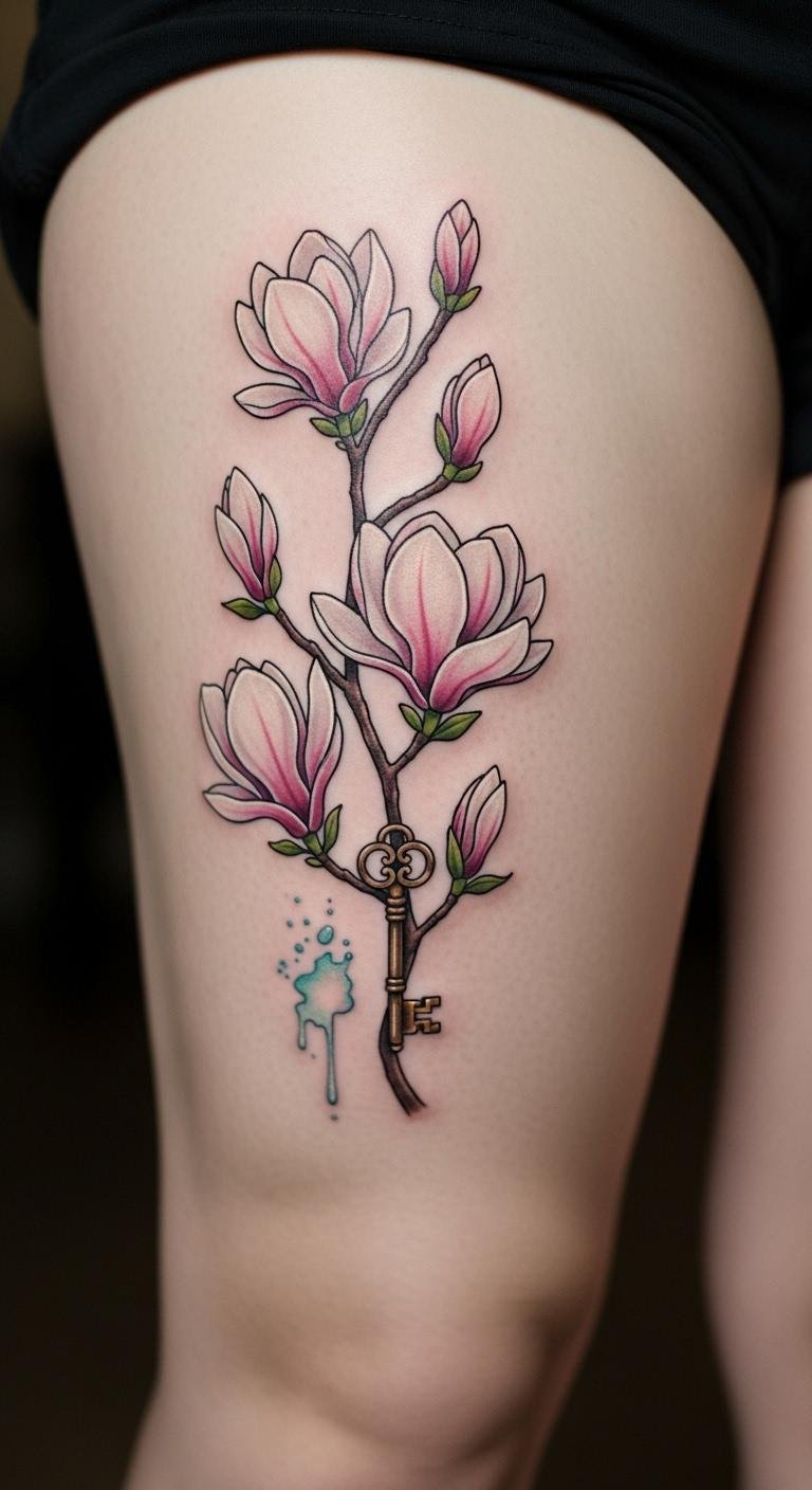 Thigh magnolias hold deep meaning. Think of the flower on your thigh. This design tells your story. Sketch meaningful additions. Use free thigh guides. Get it for $110. Include custom touches. Add layers gradually. This spot allows expression. Try leg drawings. It connects deeply. Focus on themes. You’ll value the narrative.