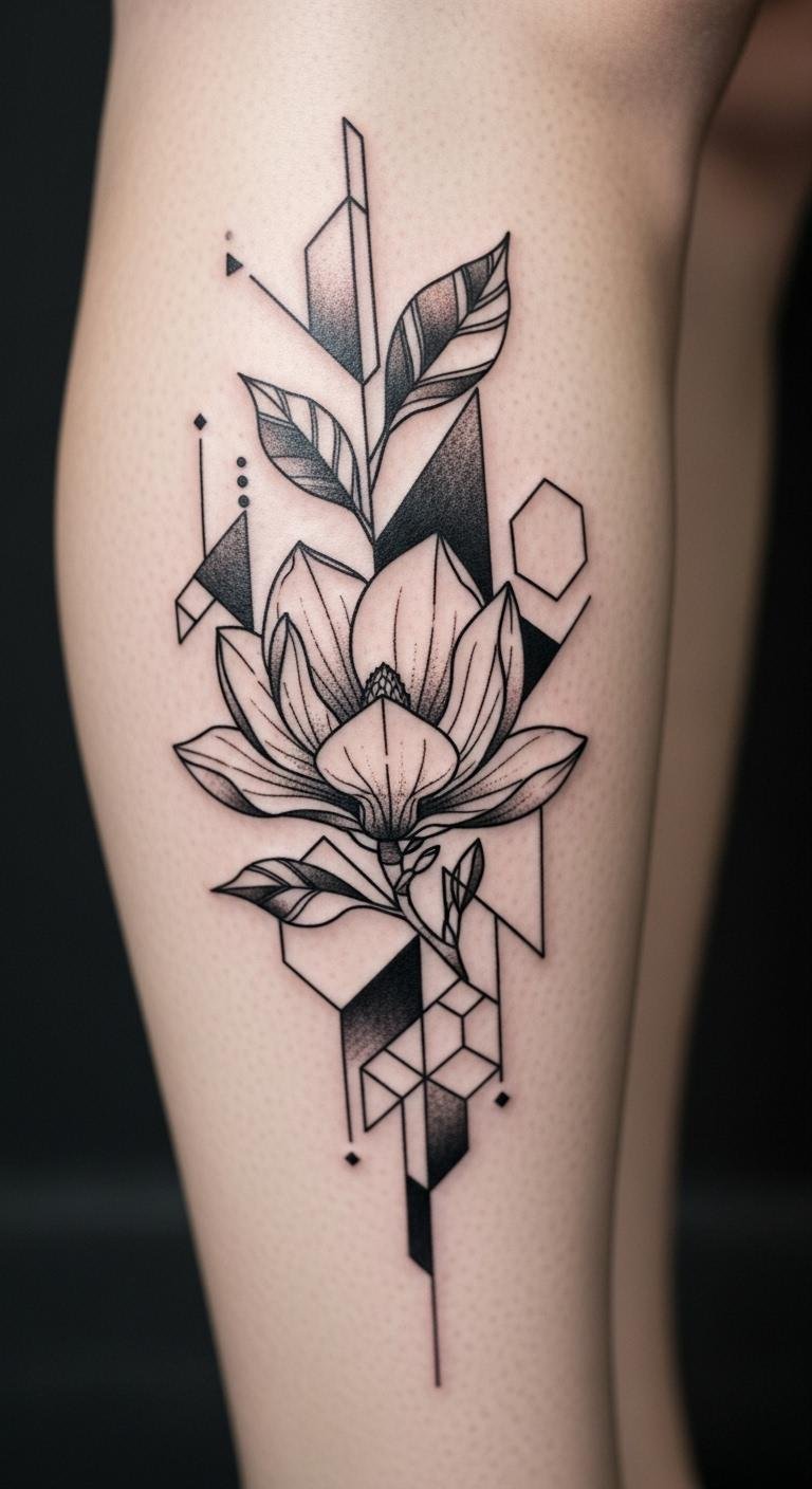 Abstract geometric magnolias mix shapes. Picture geometric forms on your leg. This design modernizes the flower. Draw shapes simply. Seek free abstract ideas. Get it for $120. Use basic geometry. Add angles for fun. This spot fits trends. Experiment on paper. It refreshes the look. Focus on symmetry. You’ll find it innovative in practice.