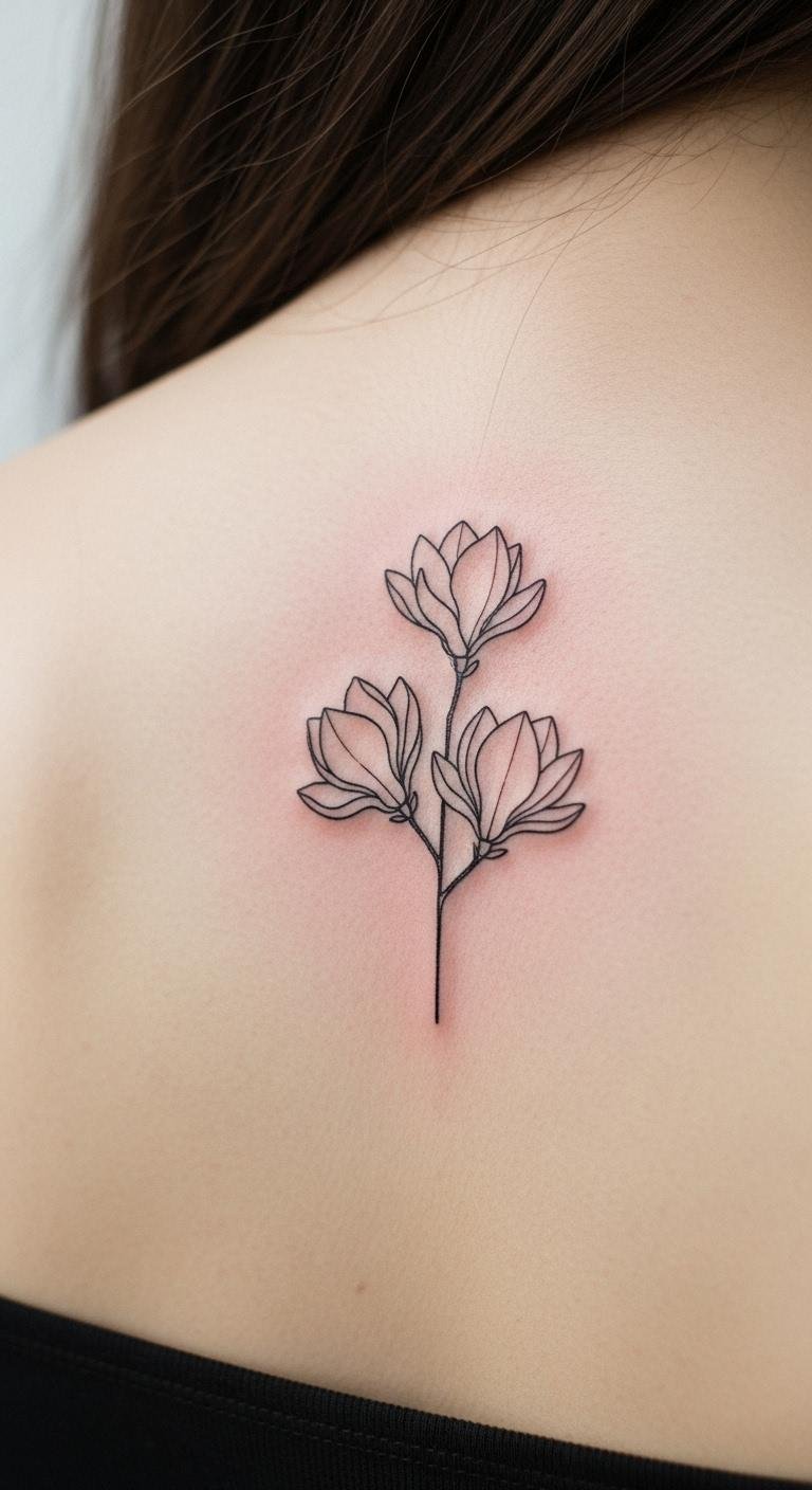 Minimalist line work magnolias keep designs clean and bold. Think of thin lines forming the flower on your ankle. This approach uses few strokes for impact. Grab a pen and sketch on paper at home. Use free online tools for templates. Look for artists charging less than $80. Opt for black ink to save on colors. Add a small stem for balance. This style fits busy schedules. Place it in a hidden spot for privacy. Practice drawing during downtime. It offers a modern edge without fuss. Focus on straight lines for better results. You’ll end up with something easy to maintain.