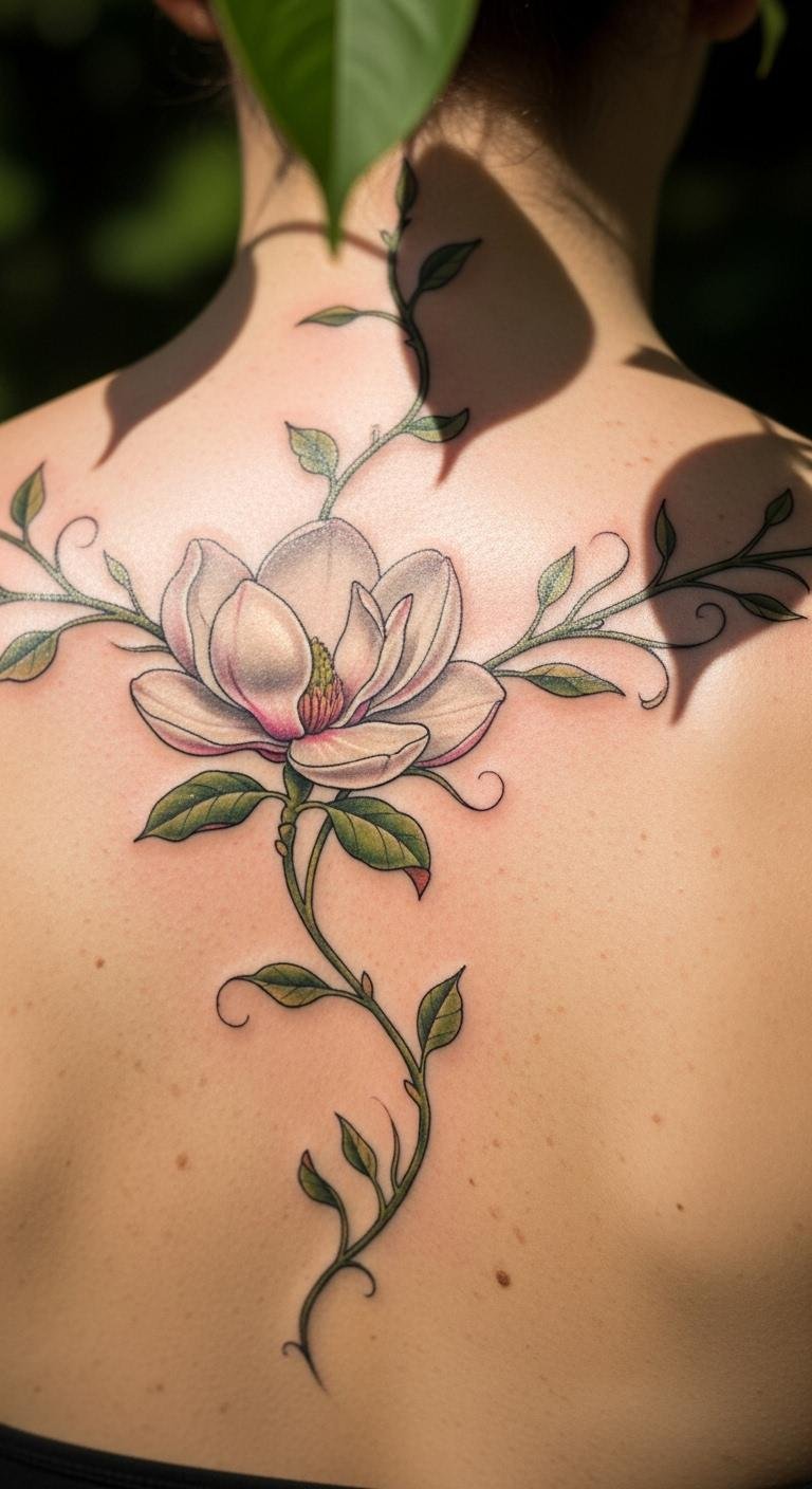 Vine-entangled magnolias embrace nature. Envision vines around the flower on your back. This design weaves elements. Sketch vines freely. Use free nature templates. Plan for $140. Keep vines simple. Add twists for interest. This area expands stories. Try vine drawings. It grounds the ink. Focus on connections. You’ll feel the harmony.