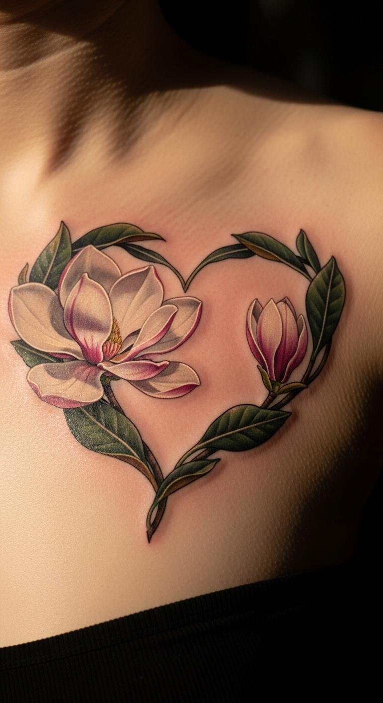 Heart-integrated magnolias add emotion. Picture the flower with a heart on your chest. This design combines symbols. Sketch hearts simply. Find free integration ideas. Get it for $110. Use overlapping shapes. Add subtle links. This spot holds sentiment. Try chest drawings. It deepens meaning. Focus on unity. These tattoos inspire action and beauty in your life. Explore these ideas to pick one that resonates, then connect with a local artist to bring it to life.