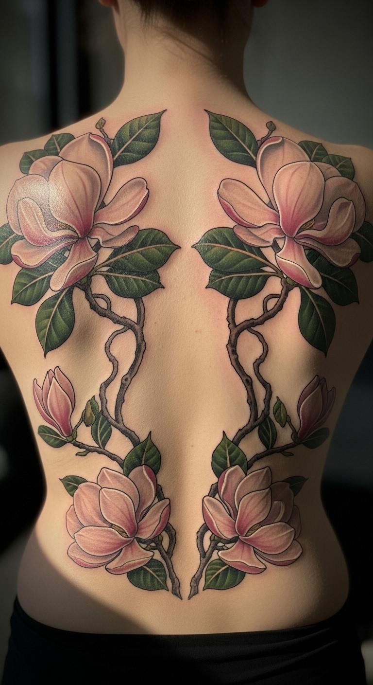 Back magnolias with multiple flowers create a grand scene. Think of several blooms spanning your upper back. This design fills space beautifully. Draw a rough layout on large paper. Look for free inspiration online. Plan sessions totaling $200. Use repeating patterns to save ink. Include varied sizes for interest. This spot allows for bigger art. Test with body paint first. It becomes a personal canvas. Focus on symmetry in sketches. You’ll love the expansive feel.