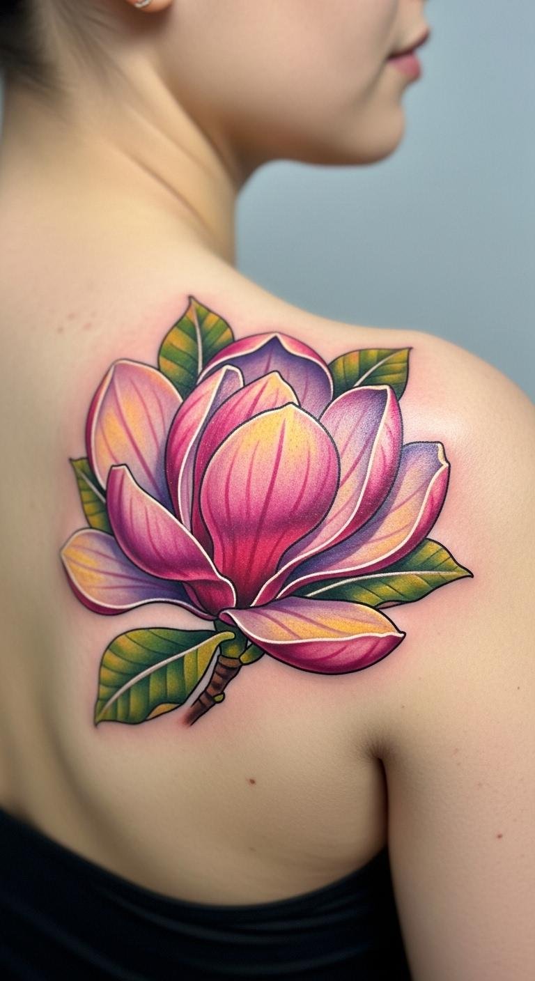 Try an elegant shoulder blossom magnolia tattoo. This design spreads across the curve for a flowing look. It highlights the flower’s natural beauty. Position it to peek out from clothes. Sketch ideas on paper to plan size. Use free software to adjust shapes. Go for a simple version to save money, around $120. Combine with leaves for depth. It’s great for events and adds a personal story.