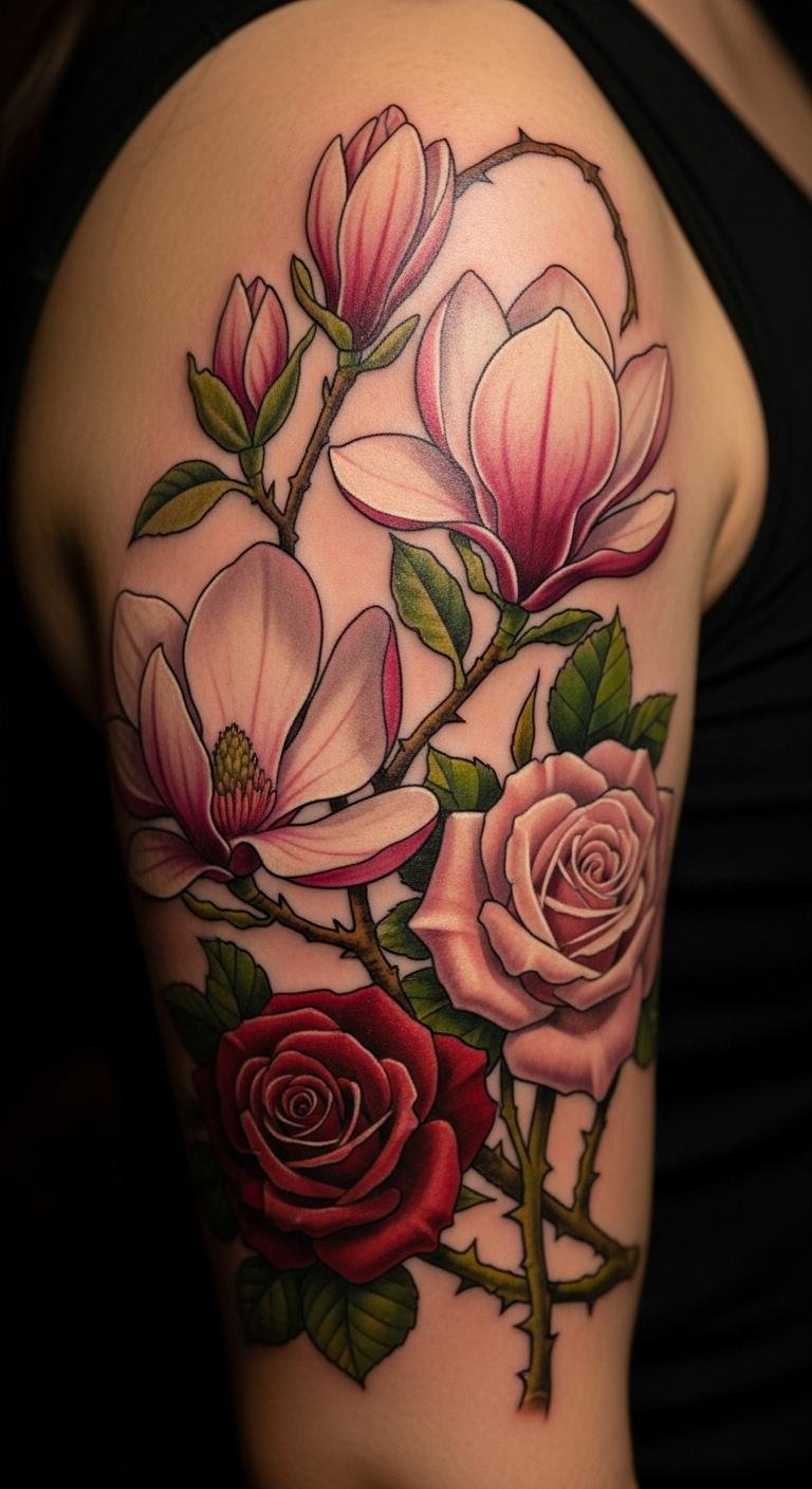 Try a magnolia and rose combination tattoo. These flowers blend for a rich look. It shows unity and beauty. Put it on your side for flow. Sketch pairs on paper first. Use garden photos for inspiration. Stay under $140. Add thorns for contrast. Ideal for love stories and visual pop.