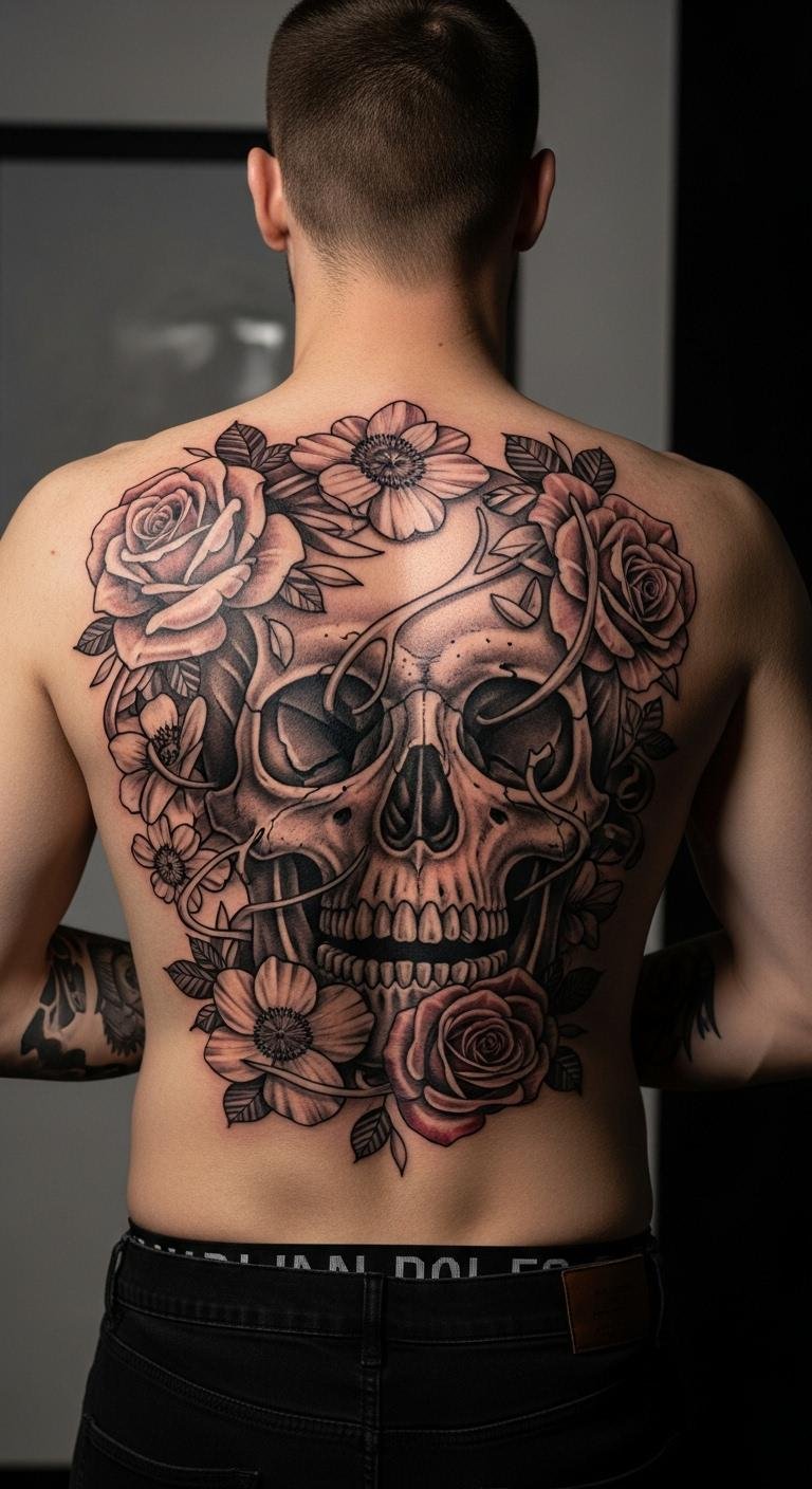 Pairing a skull with florals creates a balanced back tattoo that mixes toughness and beauty. It tells a story of contrast on your skin.