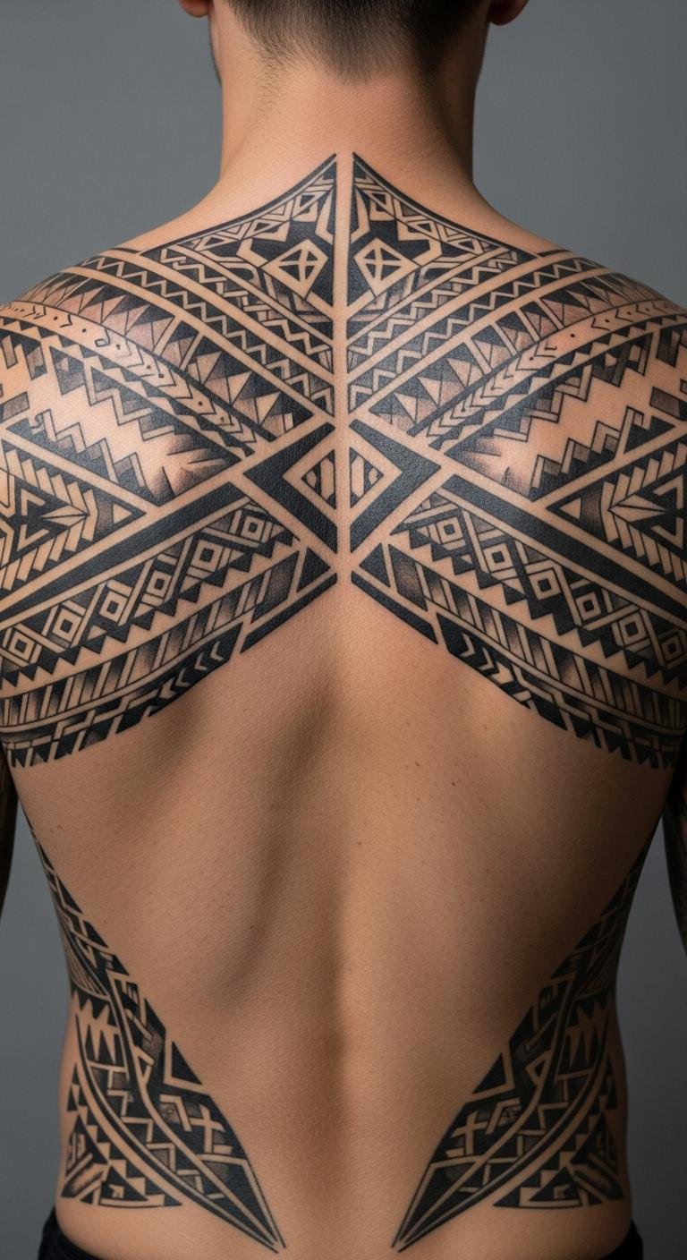 Geometric tribal patterns make for a modern back tattoo that shows strength through shapes. They create a structured look.