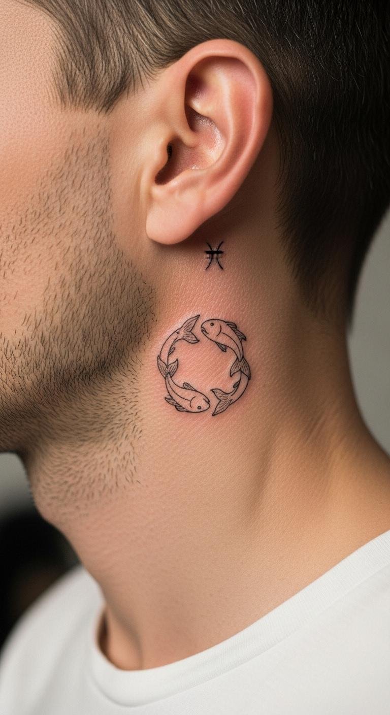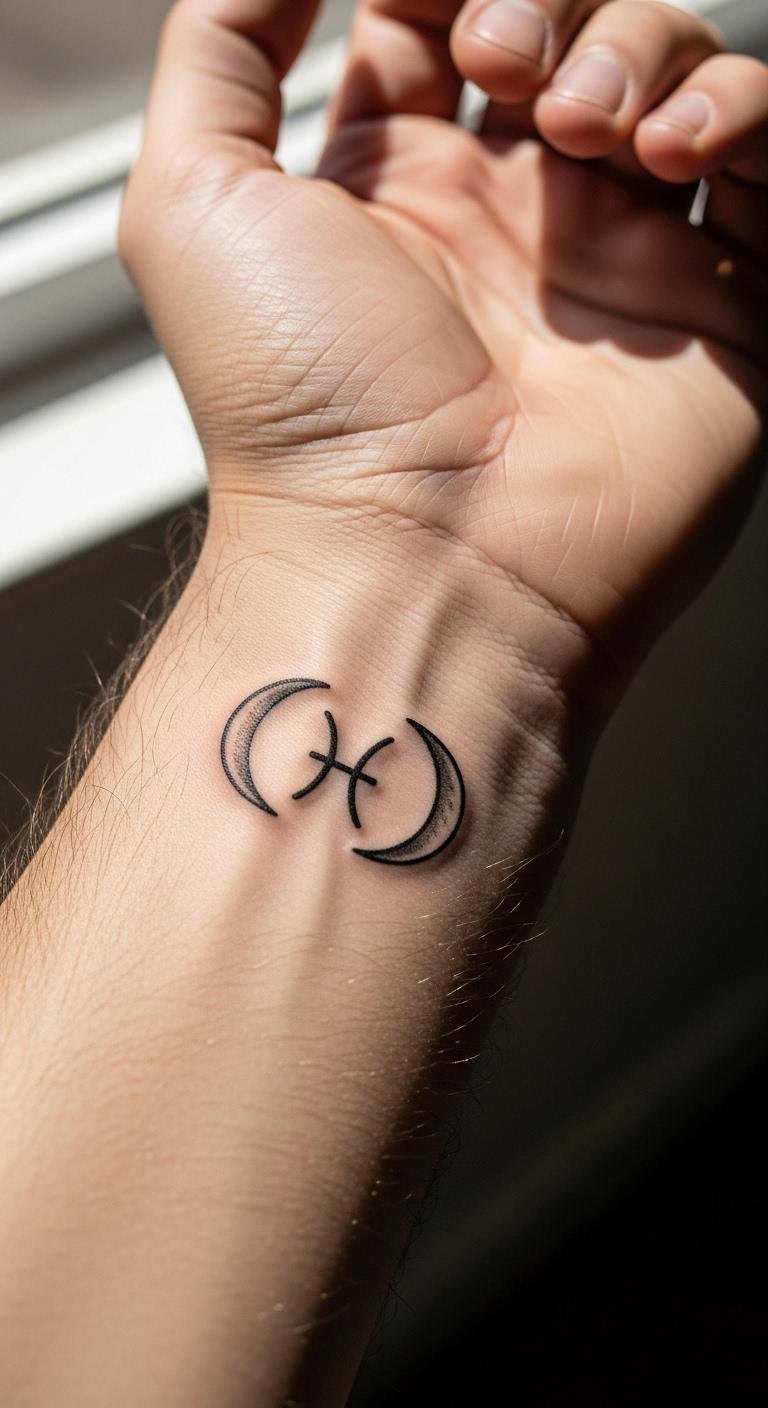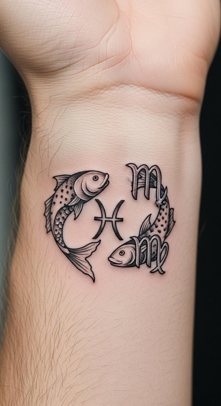 Think simple yet meaningful. A minimalist Pisces glyph uses just the ♓︎ symbol in clean lines. This design fits men who like subtlety. Start with a sketch on paper using a fine-tip pen. Practice drawing the glyph from online templates—free ones abound. Find a local artist for under $50 if you shop around budget spots. Add a personal twist, like a small wave line. Go for black ink to keep costs down. This tattoo works on the wrist for easy hiding. Try a DIY stencil at home with tracing paper and ink. You’ll end up with something timeless that speaks volumes without overwhelming your look.