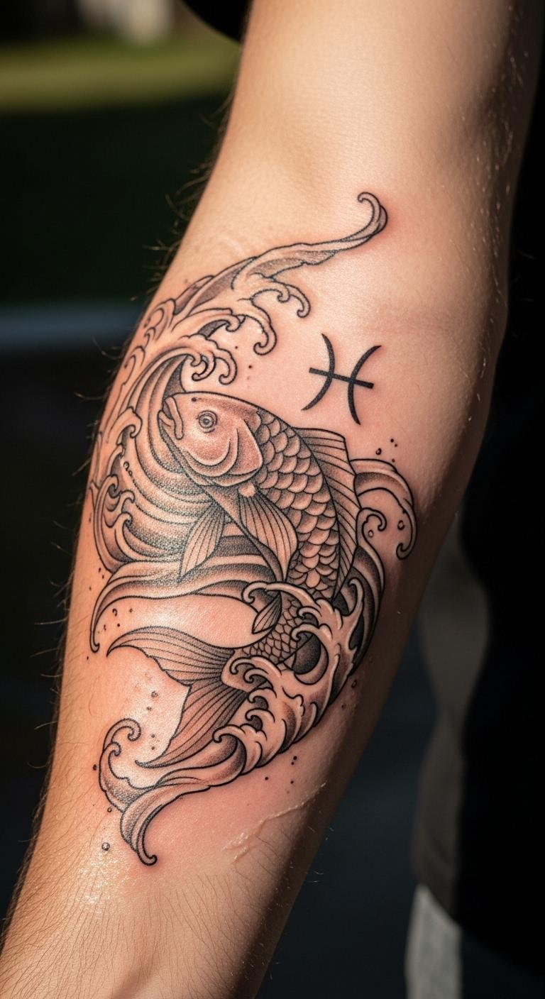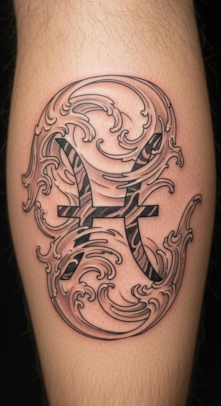 Waves add flow to your Pisces ink. Picture the ♓︎ symbol wrapped in gentle ripples. This represents emotional depth. Sketch waves freehand at home with a marker. Use online tutorials to refine your idea—no fancy tools needed. Find an artist for around $80 by checking community events. Stick to basic black ink for simplicity. Put it on your leg for a cool factor. Experiment with DIY stencils using household items like cardboard. This tattoo brings a natural feel. It’s easy to personalize without breaking the bank. Wear it proudly as a nod to your water sign.