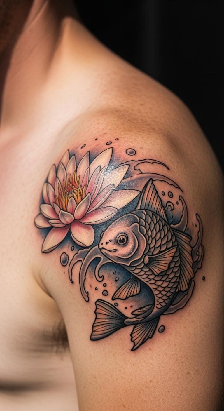 Mix in a flower like a waterlily for harmony. It softens the fish motif while keeping it masculine. Start by drawing fish and petals on plain paper. Free drawing guides online can help. Get this done for less than $100 at a walk-in shop. Use simple shading to avoid complexity. Place it on your chest for a personal touch. Try a DIY version with temporary tattoos first. This design symbolizes growth. Keep costs low by using basic supplies. It’s a fresh way to show your sign’s beauty.