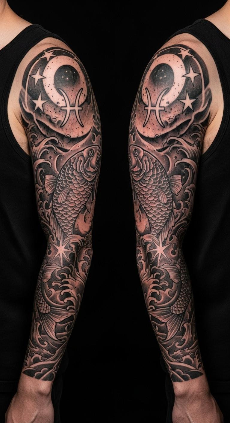 Turn your arm into a story with fish and stars. This larger design allows for storytelling. Plan it out with sketches using free software. Look for artists offering packages under $300. Focus on key elements like stars for spirituality. Position it as a half-sleeve for impact. Practice with affordable markers at home. Add waves for extra flair. This tattoo grows with you. Choose budget-friendly ink colors. It’s perfect for men wanting depth.
