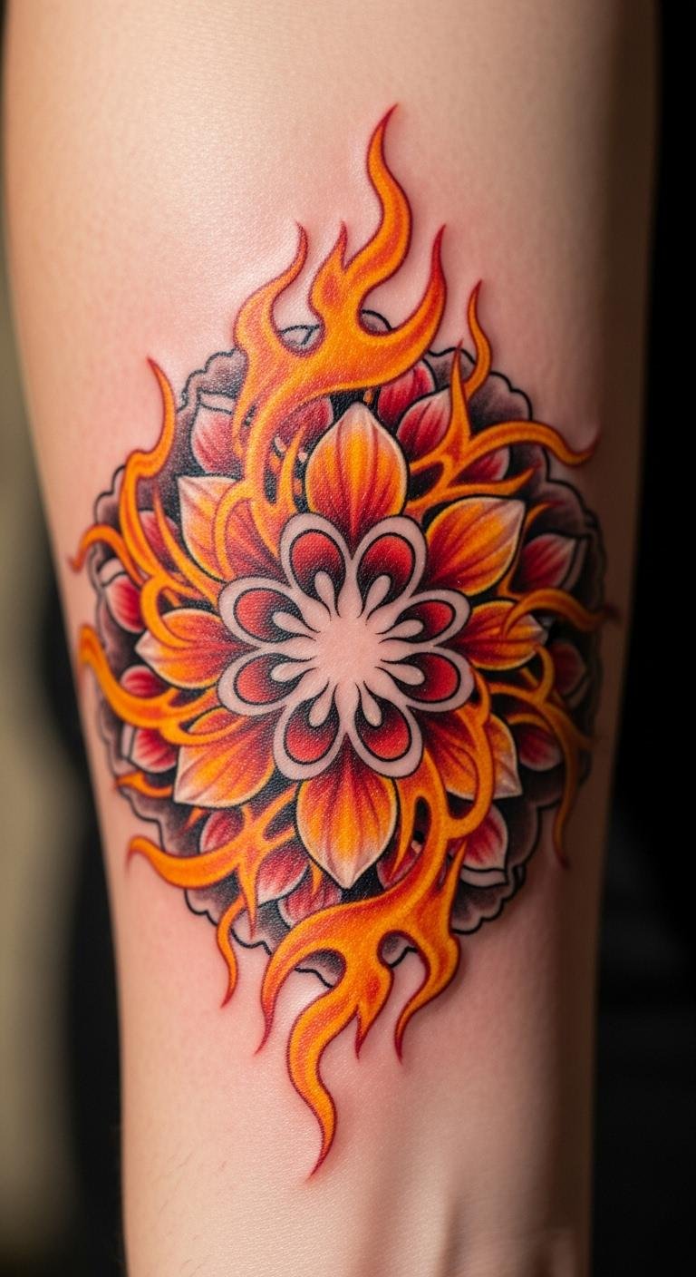 A fire and flower mandala mixes flames with petals for energy. Think of it as a fiery way to express passion. Draw flames with flowers on fire-themed paper. Get temporary fires for tests. Put it on your forearm for bold show. Use orange hues for heat. Add spark details for fun. This design fits energetic sessions. Try flame drawings at home. Choose fire artists at budget rates. It ignites your style.