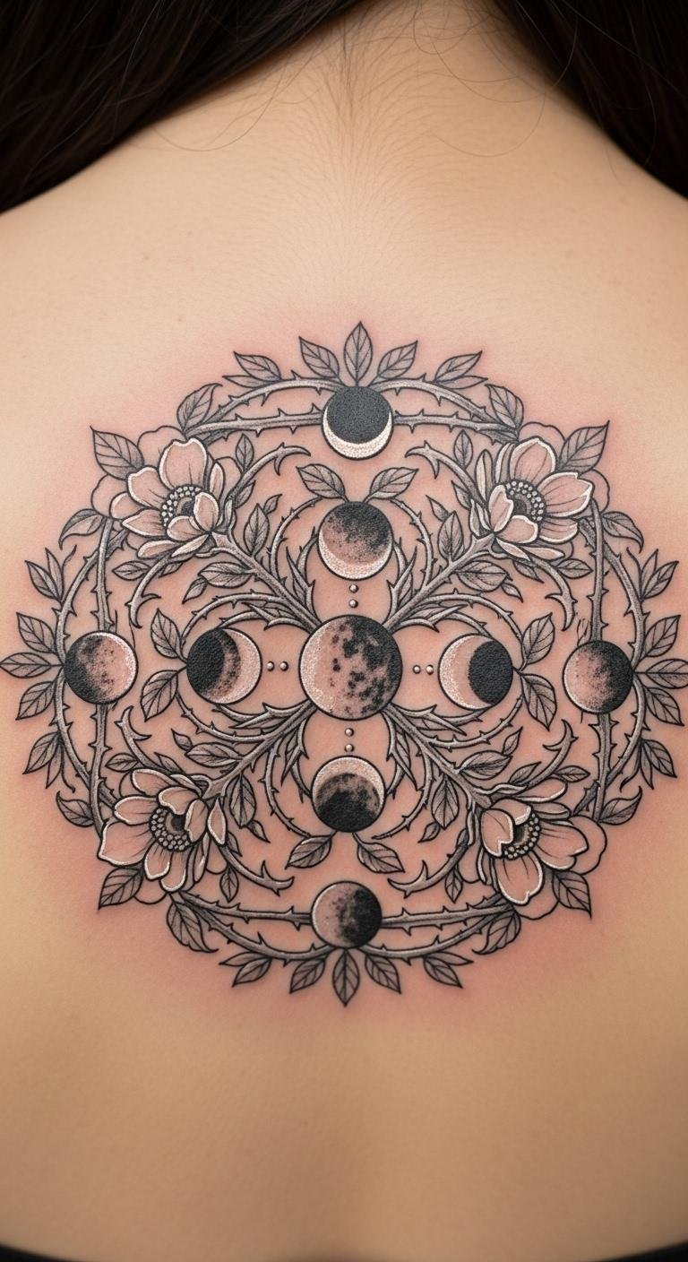 A moon phase floral mandala ties moons and blooms for mystery. View it as a lunar pick for your skin. Sketch moon phases with flowers on night paper. Find affordable moon stickers. Set it on your back for cosmic feel. Go with silver tones for mystery. Include star accents for wonder. This style works for phased sessions. Use moon apps for planning. Look for cosmic artists at low costs. It lights up your nights.