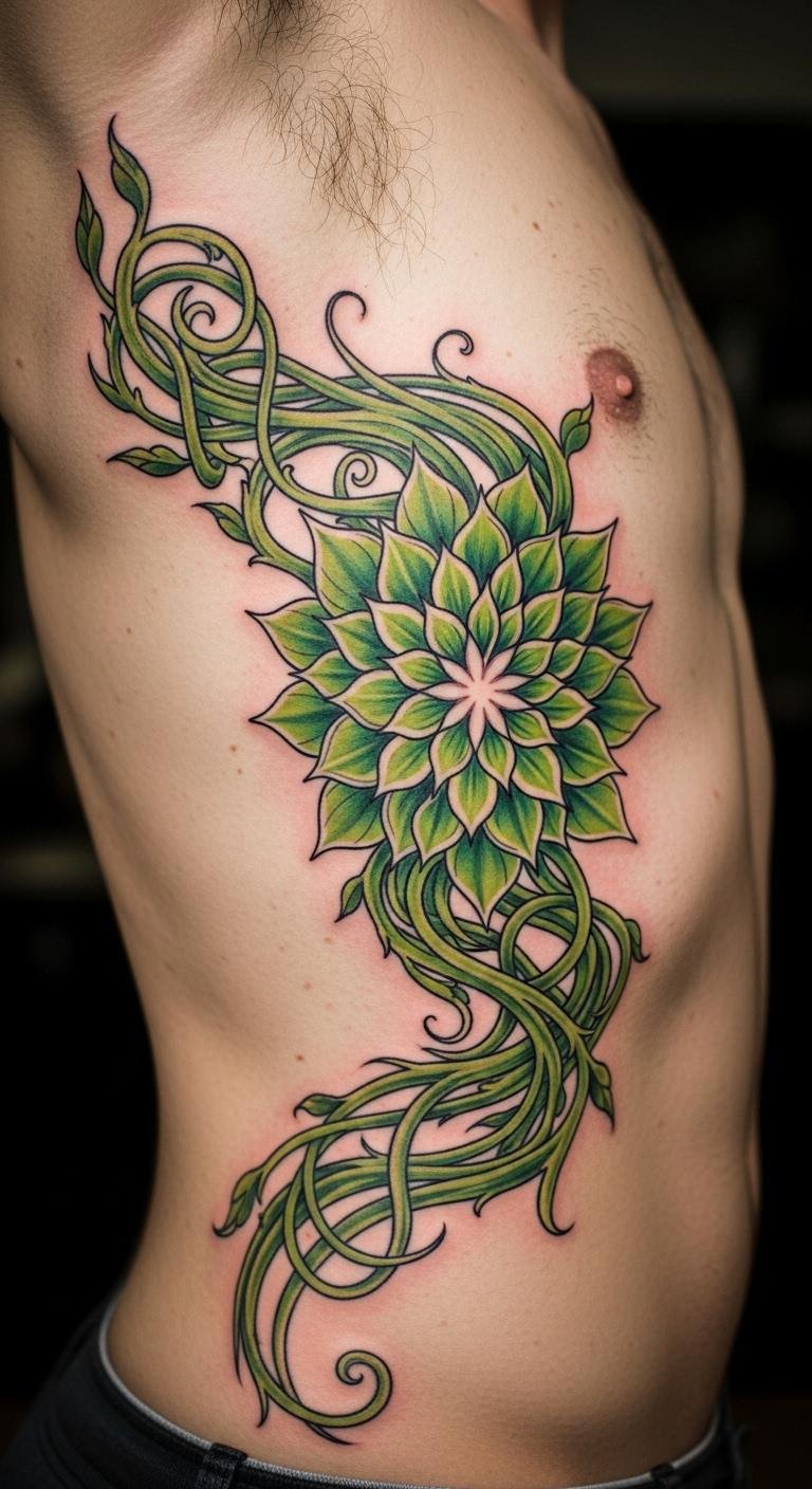 A vine and petal mandala weaves vines through petals for growth. See it as a growing choice for your body. Draw vines with petals on green paper. Opt for vine temporaries for trials. Place it on your rib for natural hide. Use green shades for life. Add leaf elements for freshness. This design suits growing sessions. Try vine sketches outdoors. Find nature artists at budget spots. It grows with you.