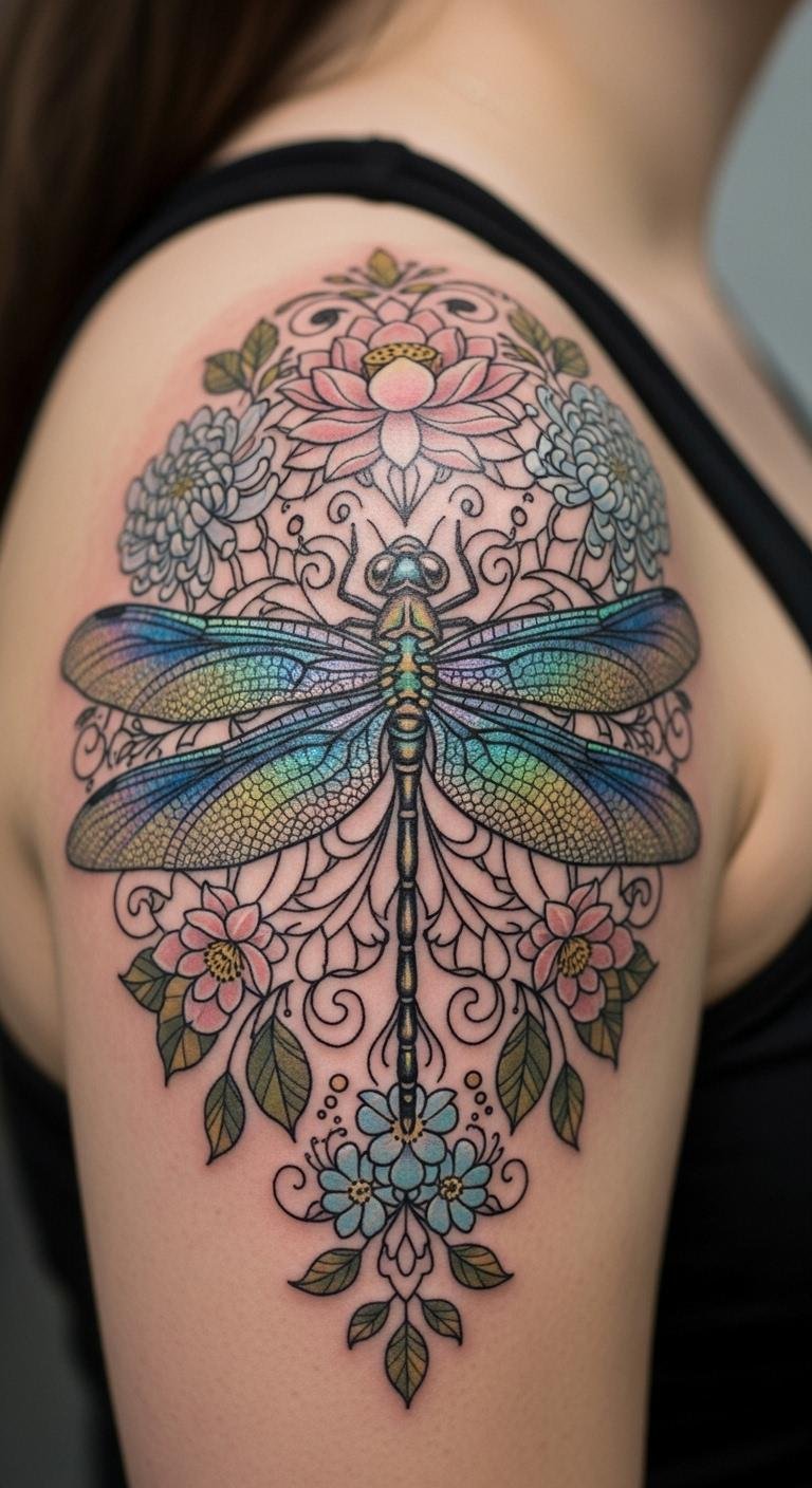 A dragonfly floral mandala pairs wings with blooms for agility. Treat it as a swift option for your ink. Sketch dragonflies with flowers on wing paper. Grab dragonfly stickers for fun. Set it on your shoulder for flight feel. Choose iridescent colors for shine. Include body details for realism. This tattoo fits agile sessions. Practice with dragonfly templates. Select bug artists at fair rates. It flies in your routine.