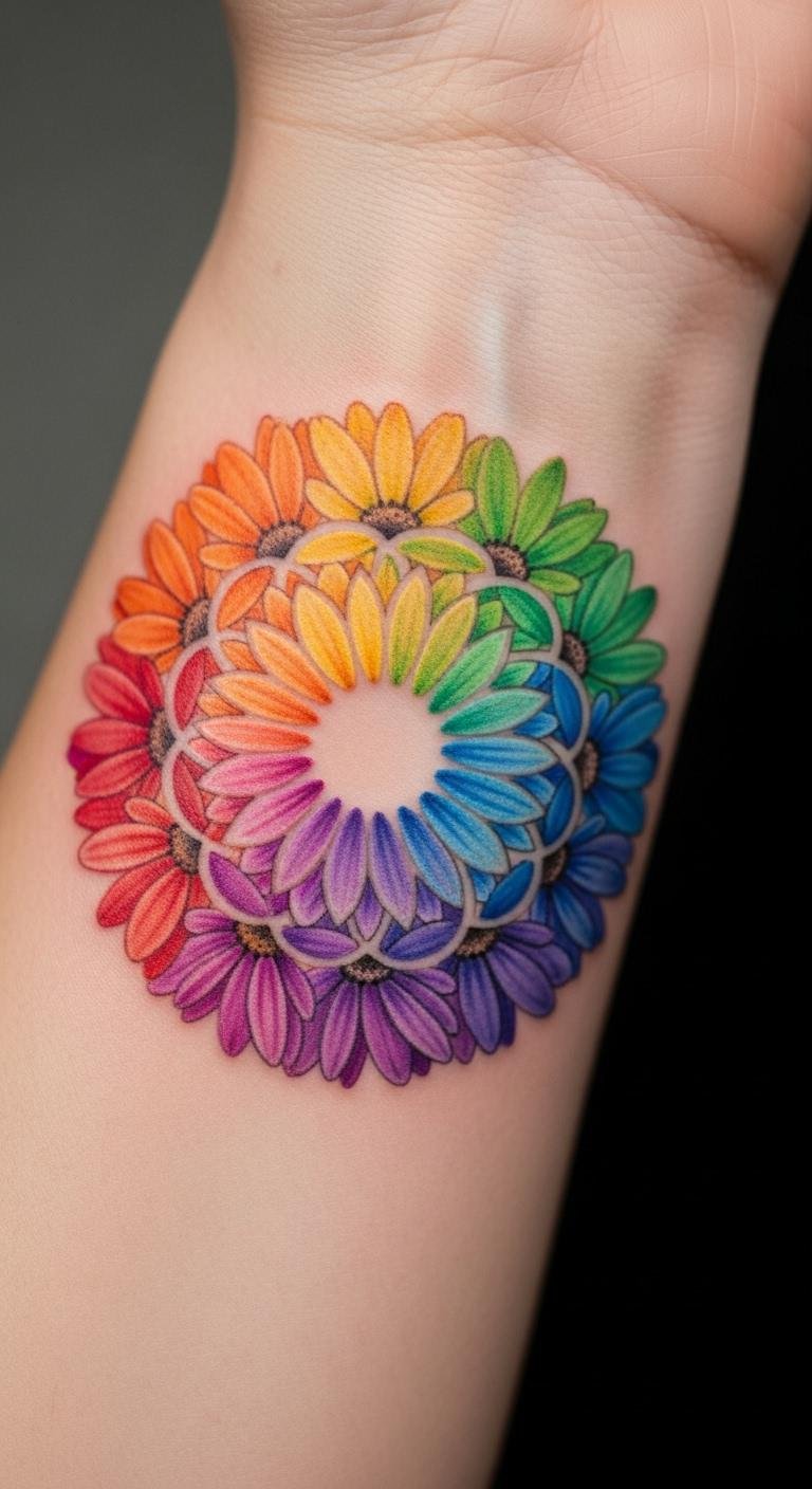 A rainbow daisy mandala layers rainbows with daisies for joy. View it as a colorful choice for your body. Sketch rainbows with daisies on rainbow paper. Opt for rainbow stickers for play. Place it on your wrist for bright access. Go with full spectrum for fun. Include center bursts for pop. This style fits joyful sessions. Use rainbow tools for home art. Find color artists at budget rates. It brightens your days.