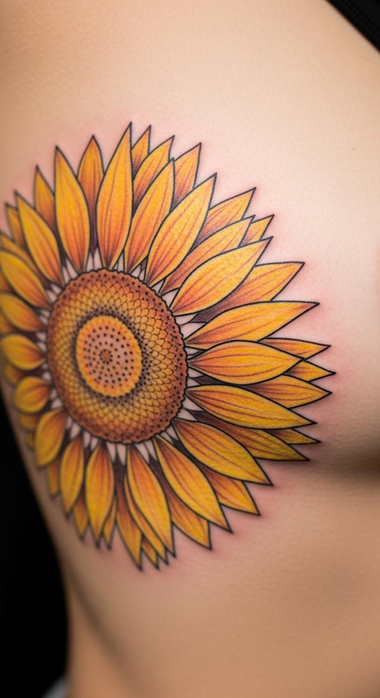 A healing sunflower mandala stands for growth and light in a circular form. View it as an easy pick for positive vibes on your body. Sketch ideas on your arm with a pencil first to see how it flows. Opt for temporary versions at drugstores for $5 to try it out. Put it on your rib for a private touch that peeks out on warm days. Choose bright yellow shades for a cheerful effect. Include small leaves in the design for added meaning. This style suits short sessions and quick healing. Use household items like a round object to trace circles at home. Find an affordable artist through local events. It pairs well with everyday outfits and feels empowering.