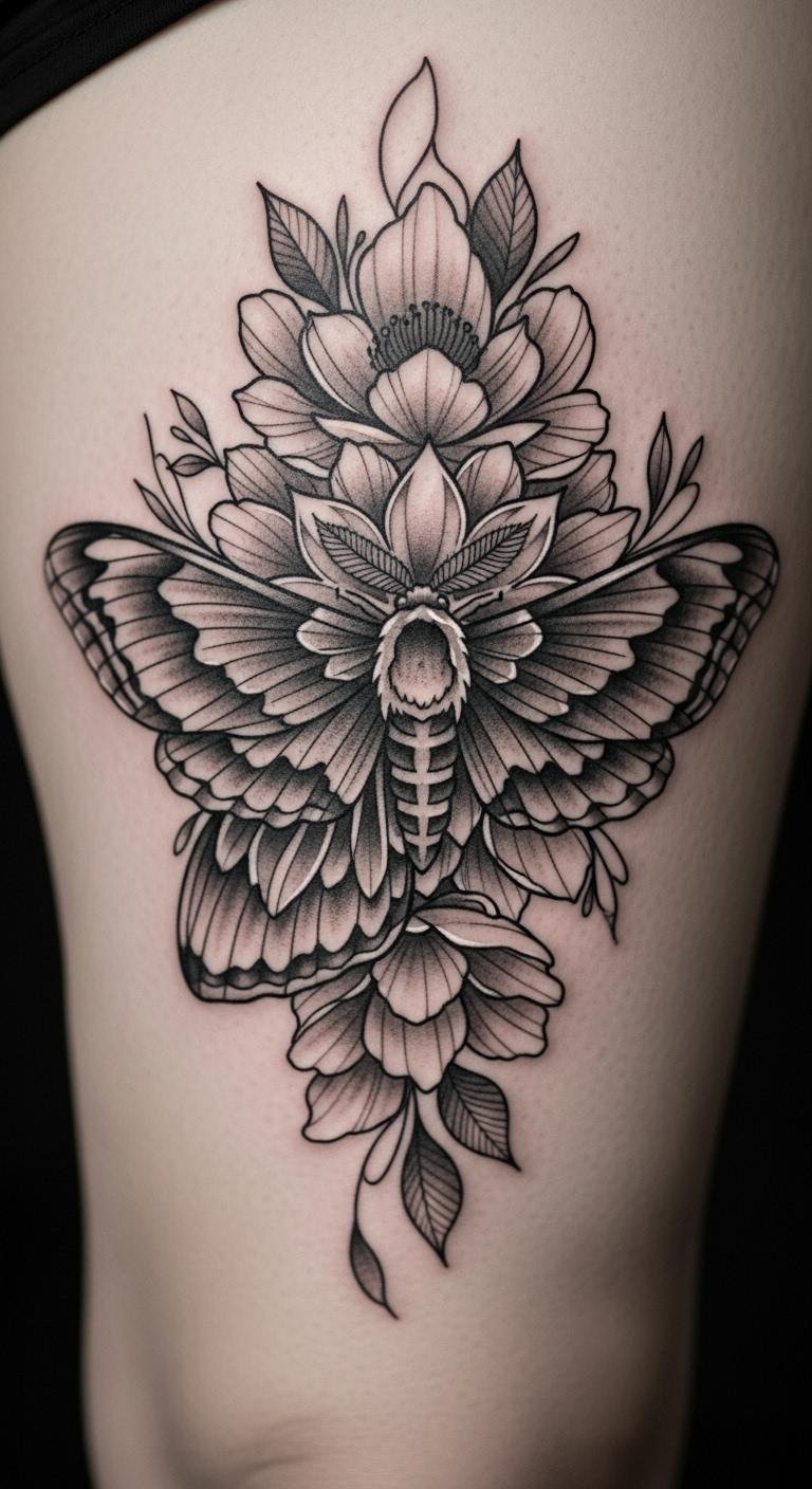 A moth and floral mandala links change with delicate blooms for a unique story. Treat it as a fun way to show transformation on your skin. Start by drawing moth wings with flowers on paper using crayons. Go for stick-on tattoos online for under $15 as a test run. Position it on your thigh for easy coverage. Stick to black ink for a timeless vibe. Add floral accents that match your favorite blooms. This design works for medium sizes and fast recovery. Practice with DIY stencils from printable sheets. Choose artists who specialize in details without high fees. It adds a personal layer to your look every day.