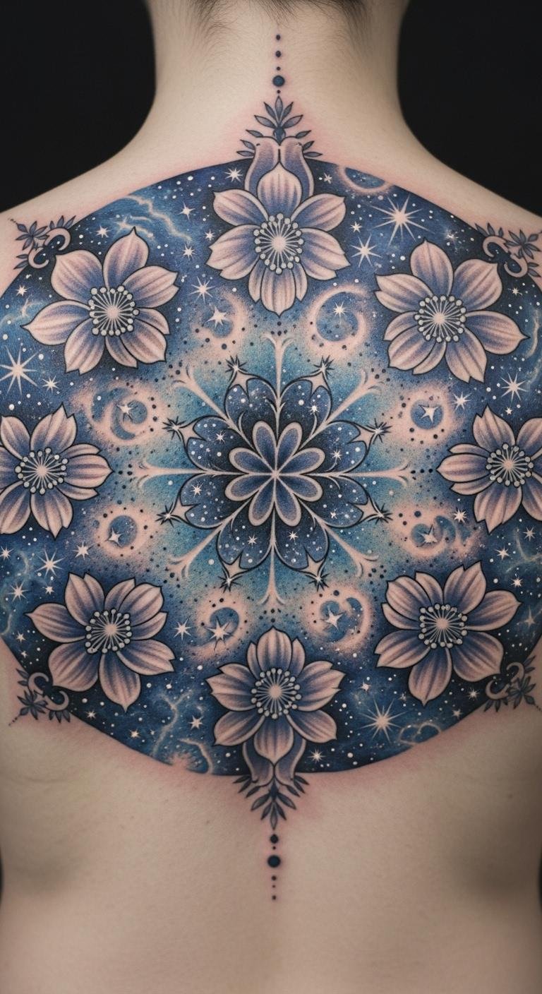 A celestial floral mandala weaves stars into flower shapes for a dreamy effect. Consider it a creative path to add wonder to your body. Sketch stars with petals on notebook paper as a start. Find affordable temporary sets online for around $10. Set it on your back for dramatic yet hidden appeal. Go with blue tones for a night-sky feel. Include moon phases in the mix for personalization. This design allows for quick sessions and good healing. Use free drawing tools on your computer to plan. Look for artists at community fairs for deals. It enhances your style in meaningful ways.