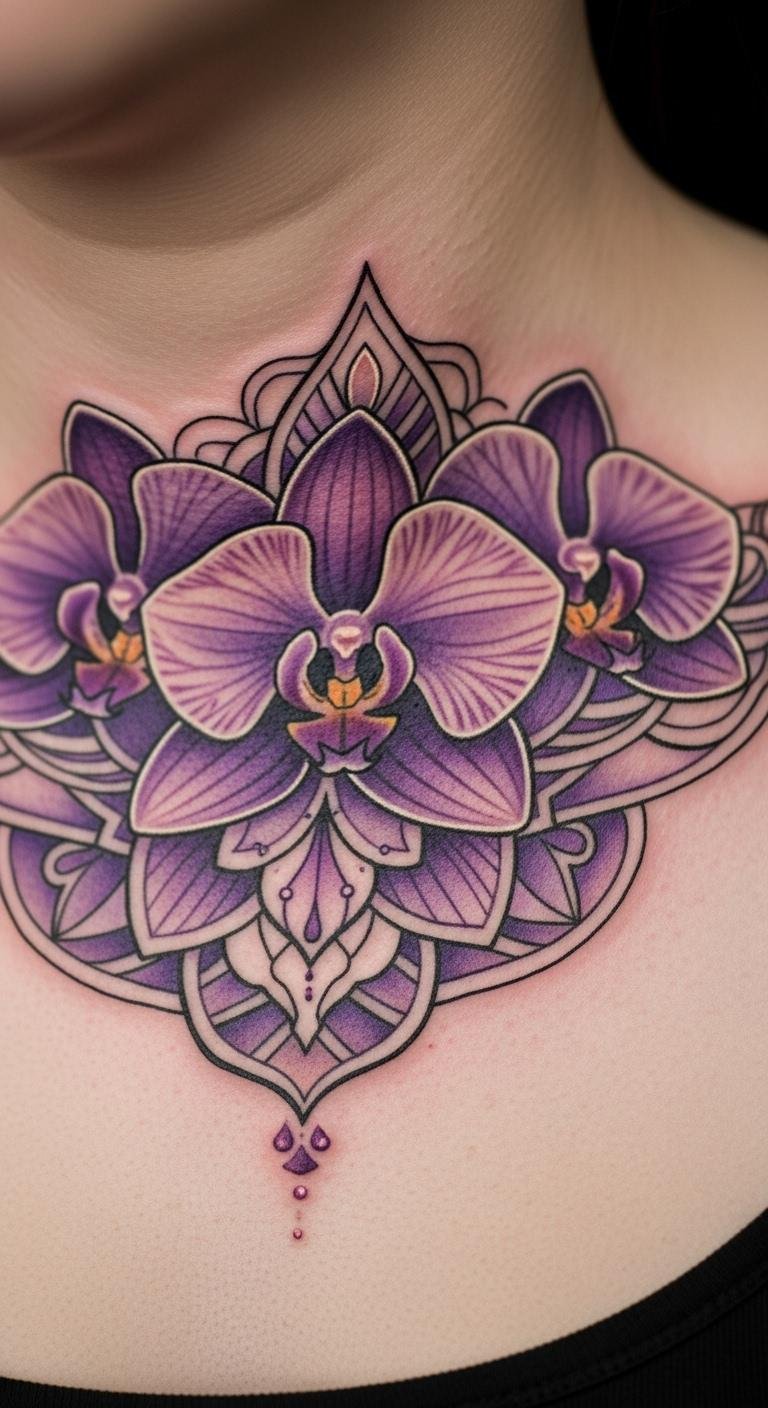A vibrant orchid mandala brings bold petals and circles for a lively statement. Think of it as an exciting way to express vibrancy on your skin. Draw orchid shapes with circles using colored pencils at home. Opt for fake tattoos from craft shops for less than $5. Position it on your collarbone for a feminine touch. Choose purple hues for that eye-catching pop. Add swirling lines for a custom edge. This style works for varied sizes and easy care. Practice with printable designs you color in. Find budget artists through word-of-mouth. It pairs well with your wardrobe and inspires daily.