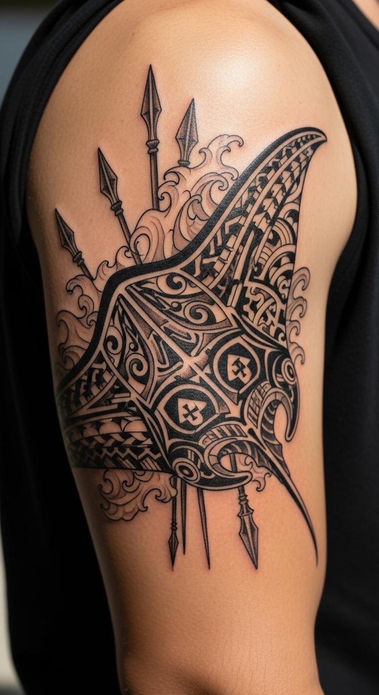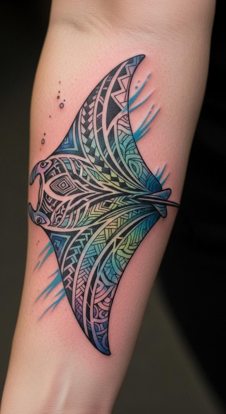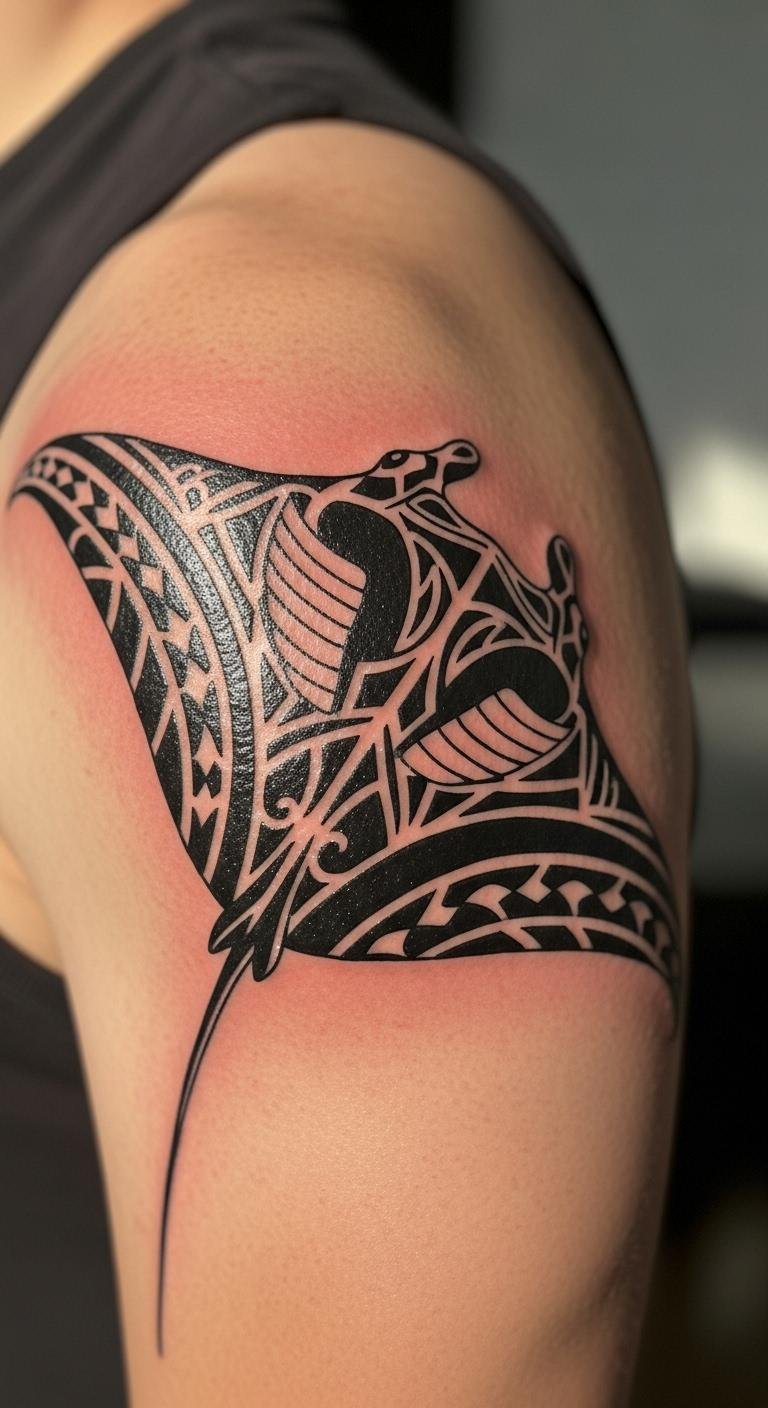 Tribal manta ray tattoos use strong lines to show cultural roots. Think patterns that flow like water. Start with a simple sketch on paper. Use free online tools to draw ideas before visiting an artist. Pick a local shop for affordable sessions. Try tracing designs from public domain images. This style adds a bold edge to your look. Keep costs low by discussing small sizes first. Add personal twists, like a simple dot for a family mark. Focus on clean lines for easy upkeep. Get friends’ feedback on sketches. You’ll end up with ink that feels right.