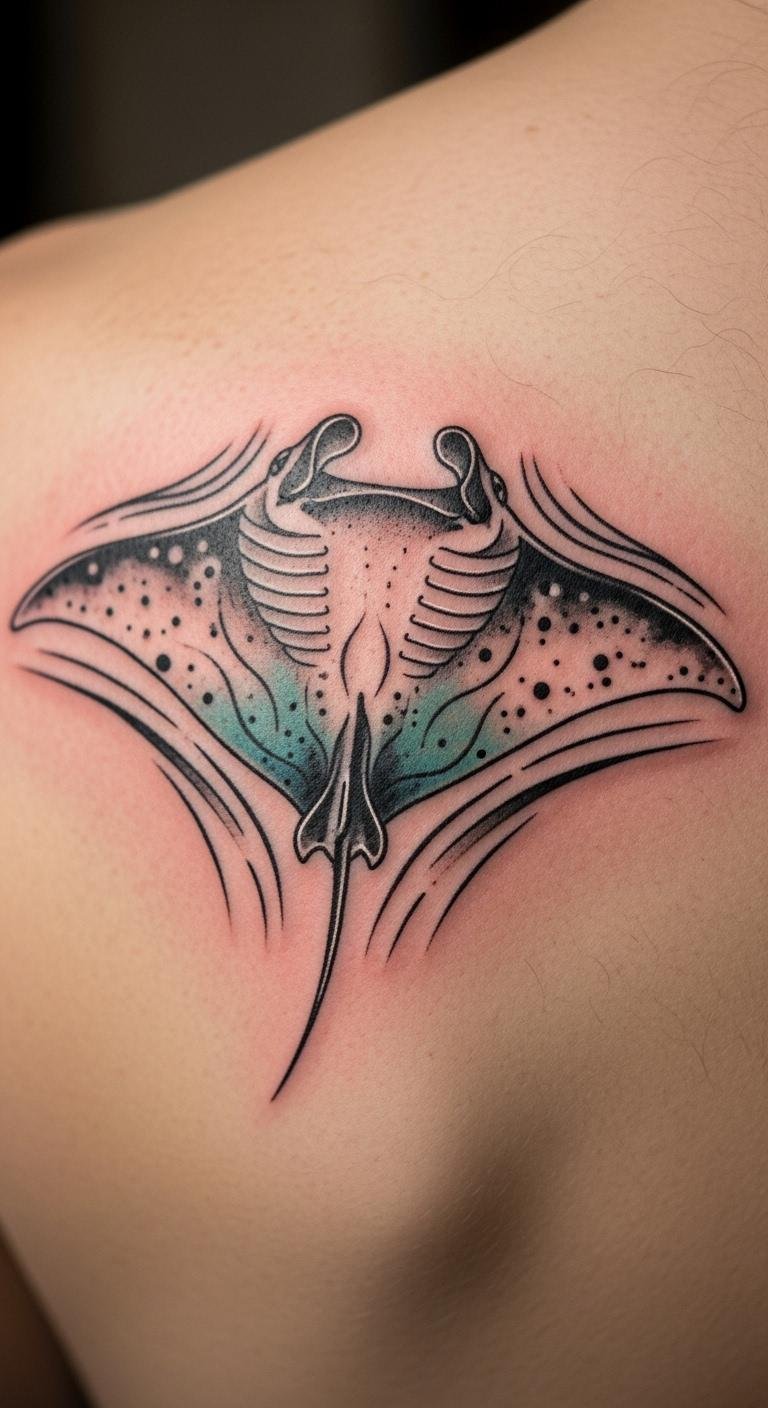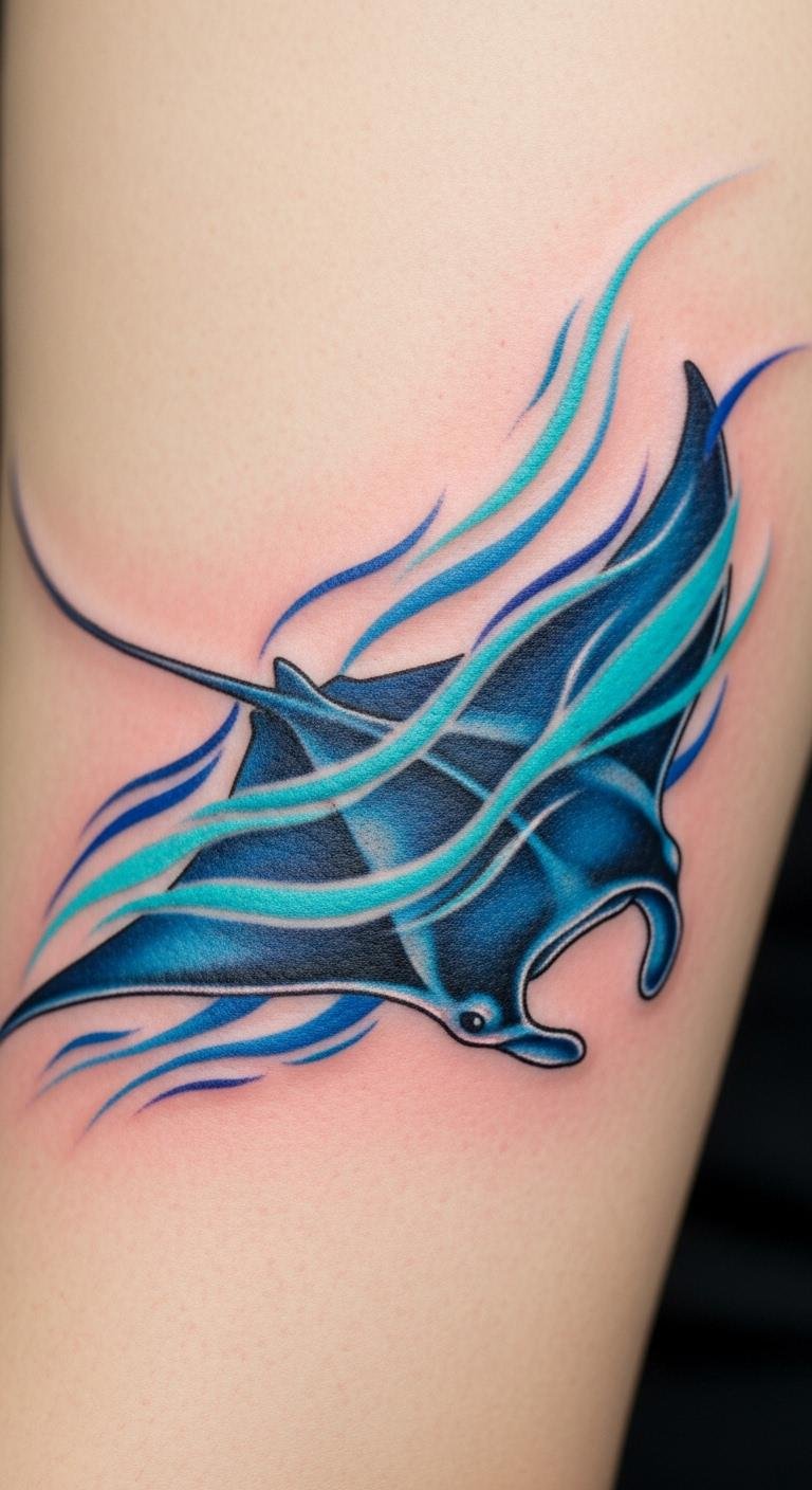 Dynamic manta ray tattoos show energy with lines. They mimic swimming. Practice drawing motion on paper. Find free dynamic guides. Opt for artists with quick styles. Add swirls for effect. This keeps things lively and cheap.