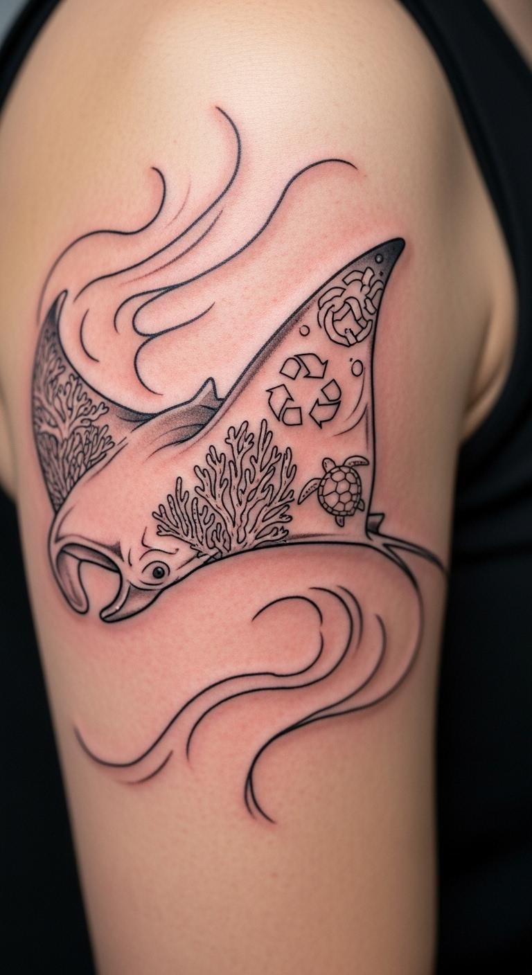Eco-themed manta ray tattoos support ocean causes simply. Use leaves or waves as symbols. Draw ideas with recycled paper. Look for free eco-art online. Find artists who align with causes. Keep designs minimal. This adds purpose without high costs.
